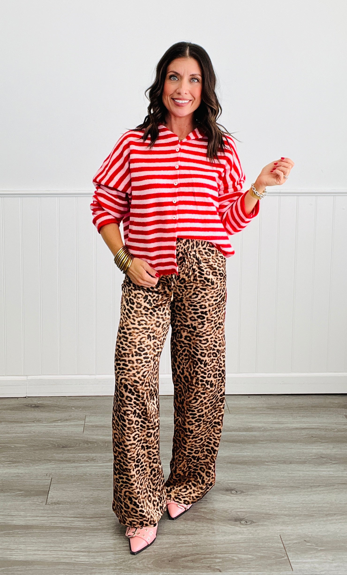 Meet the ultimate cozy-chic cardigan: our Pink/Red Gigi Striped Button Down Cardigan. With a playful button-down front and long sleeves, this sweater will keep you stylish and warm all season long. Get ready to turn heads with its big brown and ivory stripes.