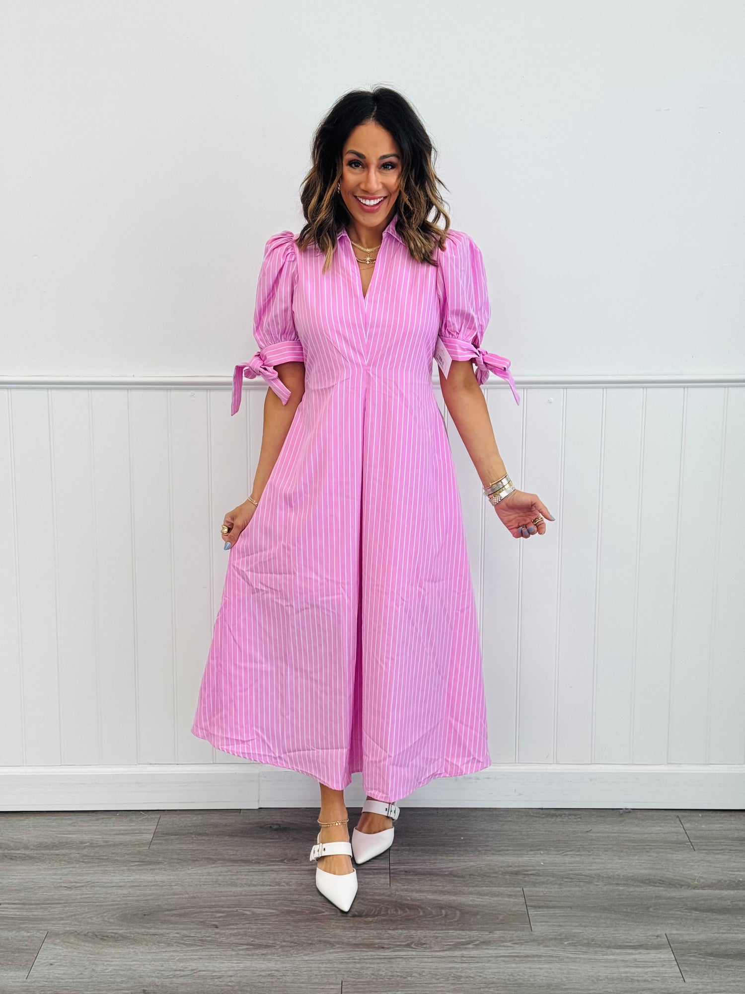 Pinstriped Short Sleeve Midi Dress (Reg.)- 2 Colors