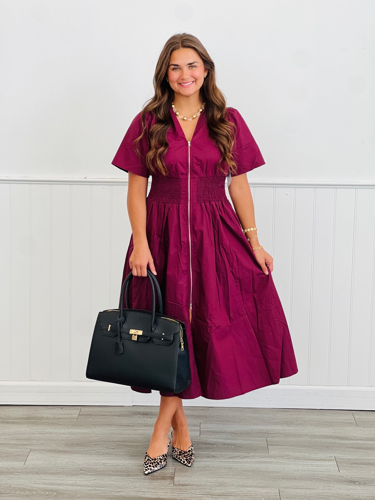Introducing the classic Front Zip Midi Dress! This super cute dress features a front zipper closure, v-neckline, short sleeves, side pockets, smocked waist and flowy midi skirt.