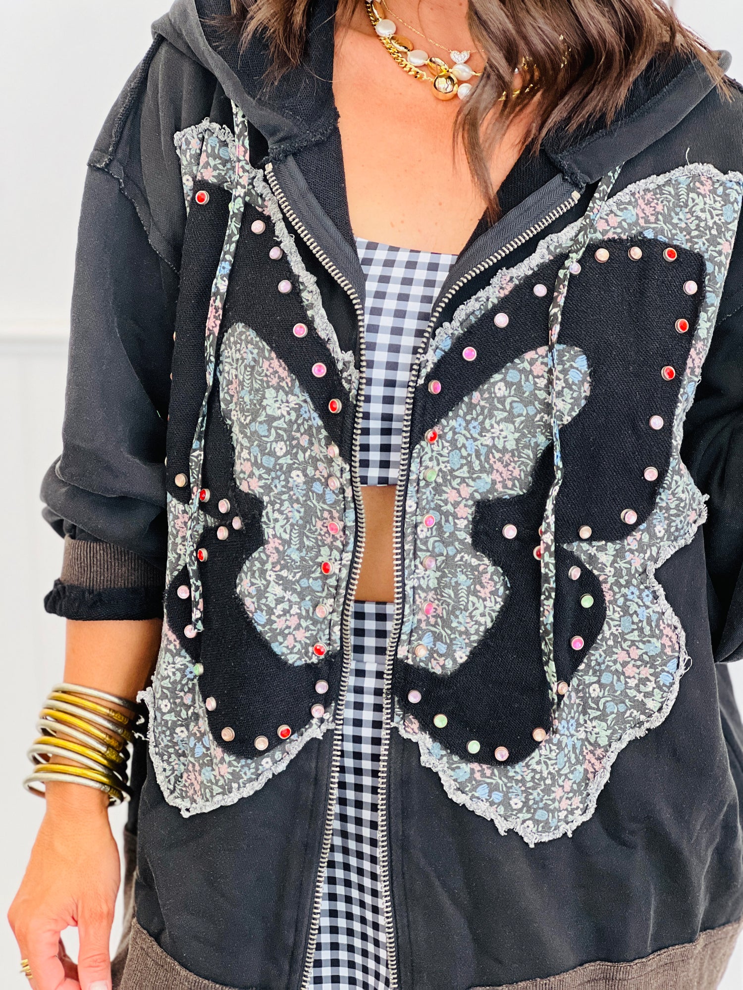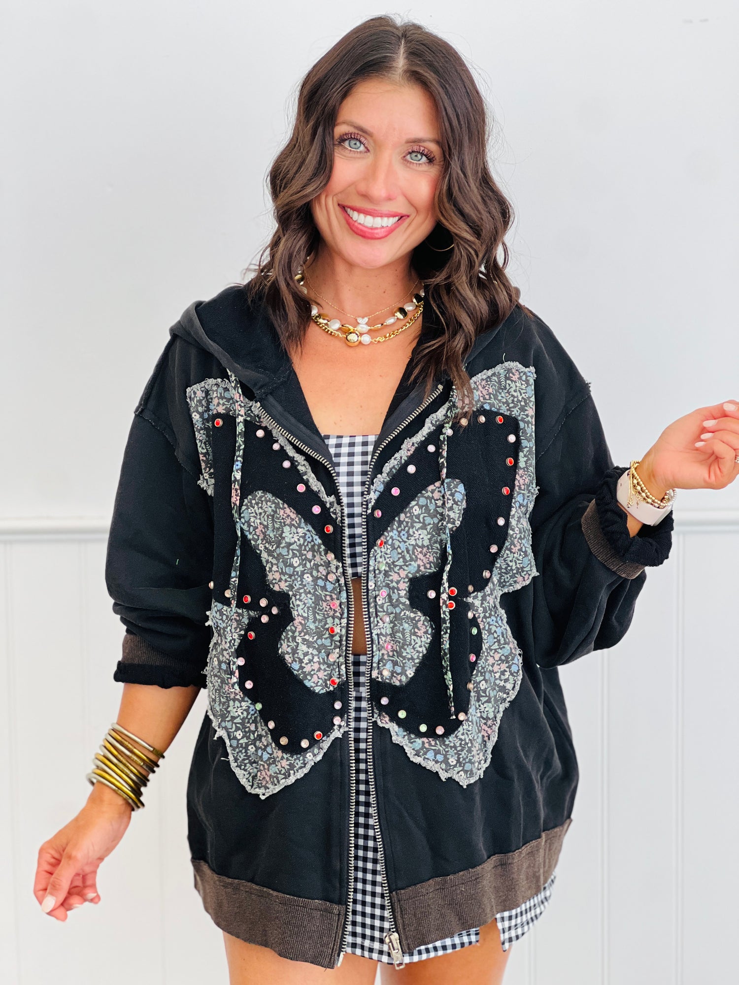 The POL Black Butterfly Zip Up Hoodie Top is designed with a delightful embellished butterfly design, balloon sleeves, French terry fabric, attached hoodie and zip up front.