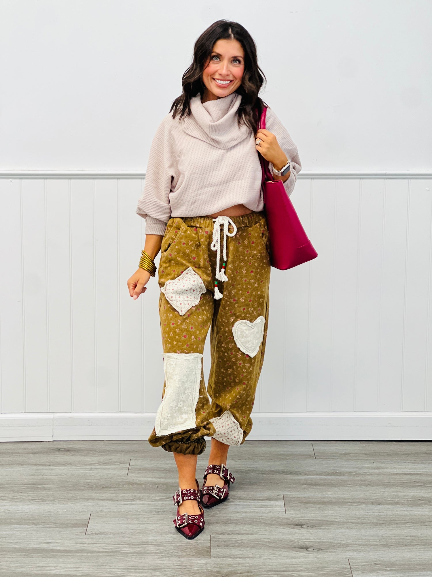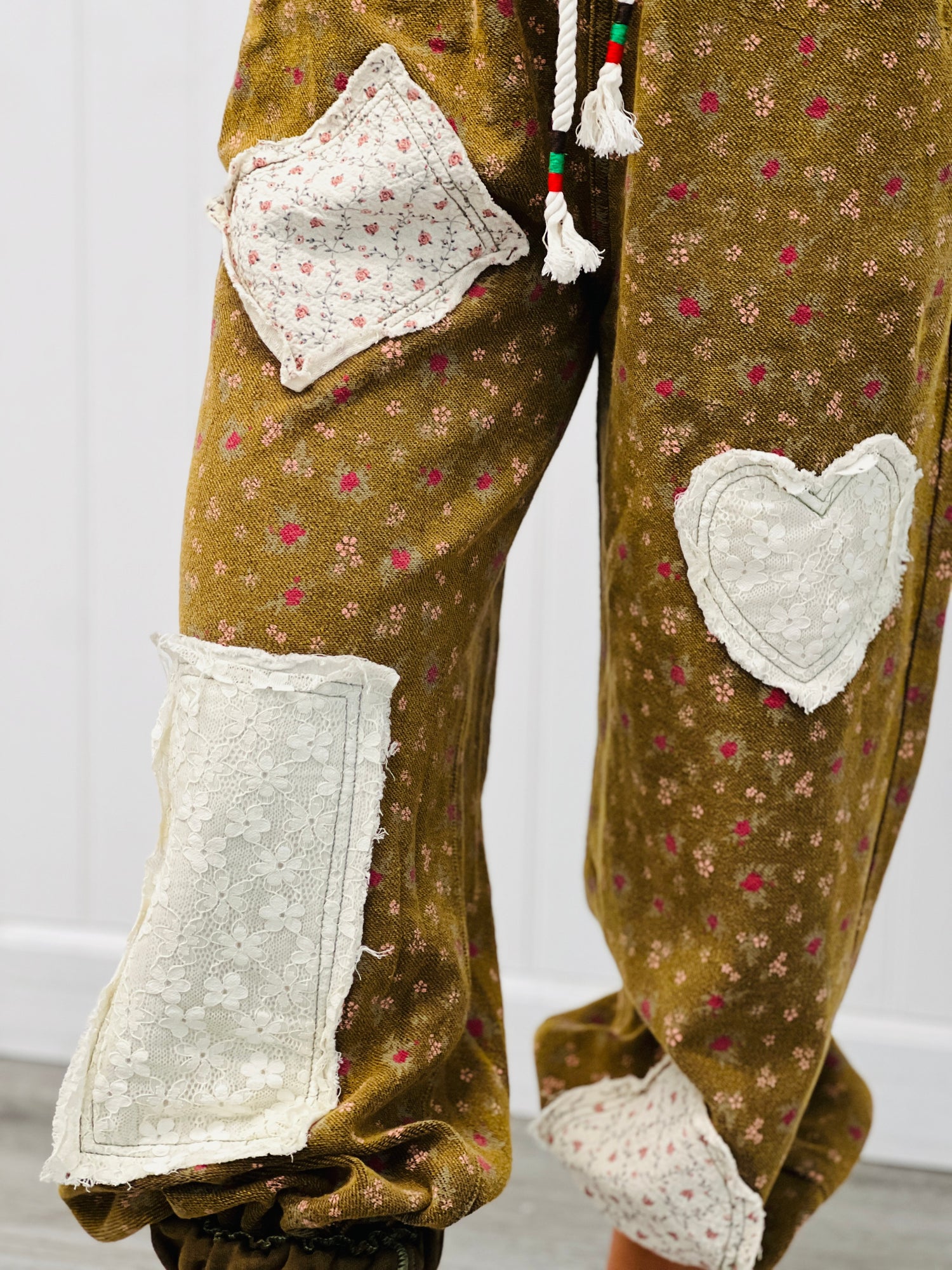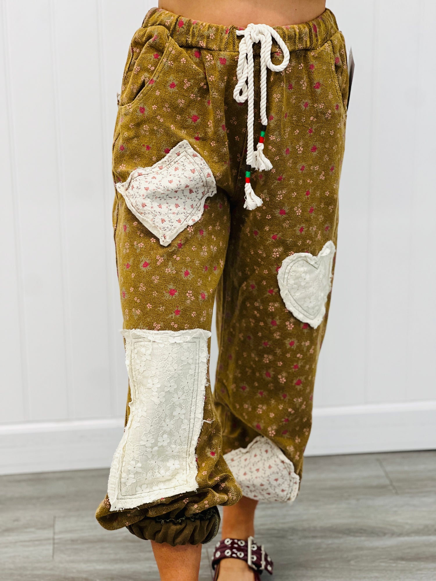 Get ready to turn heads with these super cute and comfy POL Contrast Lace & Woven Patch Pants! Designed in roomy in printed french terry with varied lace and woven patches, elastic waist and accented drawstring. waist tie.