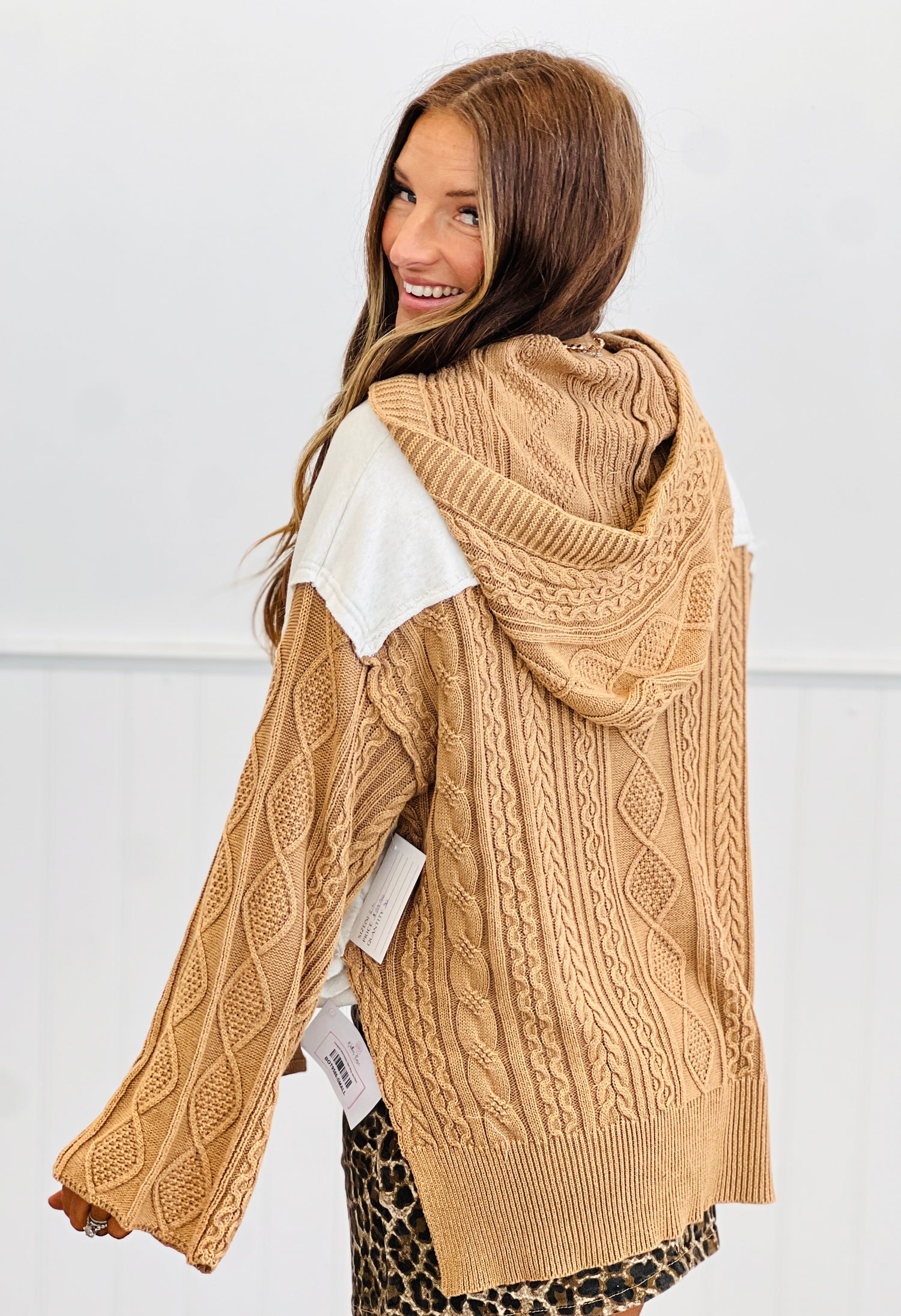 Introducing our uniquely distinctive POL Oatmeal Lace Up Contrast Hoodie Top! This trendy top features a lace-up front detail, contrast long bronze sweater sleeves with diamond pattern, attached matching hoodie, back matching the sleeves, and a relaxed fit.