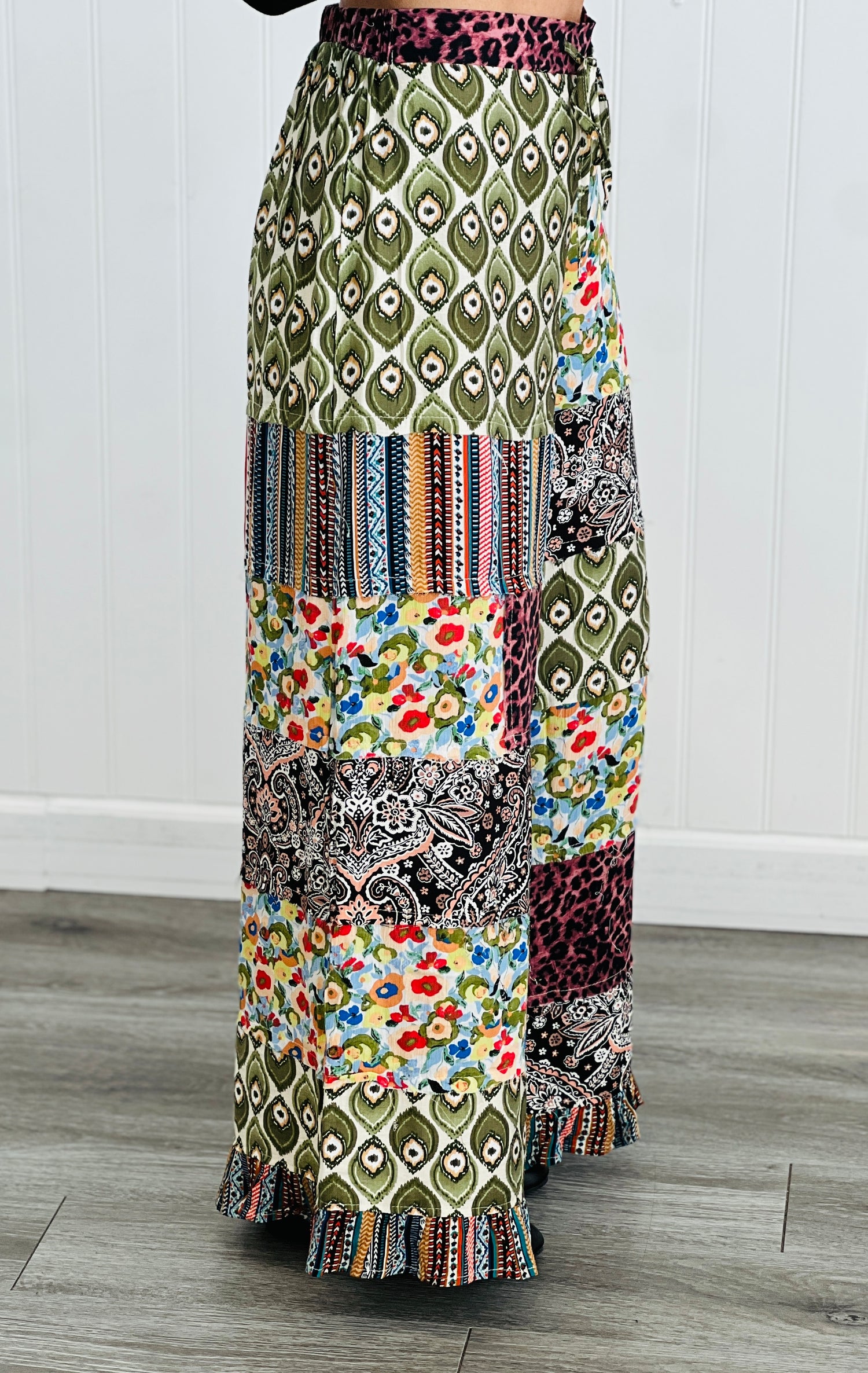 Add a fun quirky edge to your look with our Olive Multi Patchwork Pants. These wide leg pants feature a stretchy waistband with waist tie, ruffled hemline, various mixed prints and patterns and a relaxed fit.