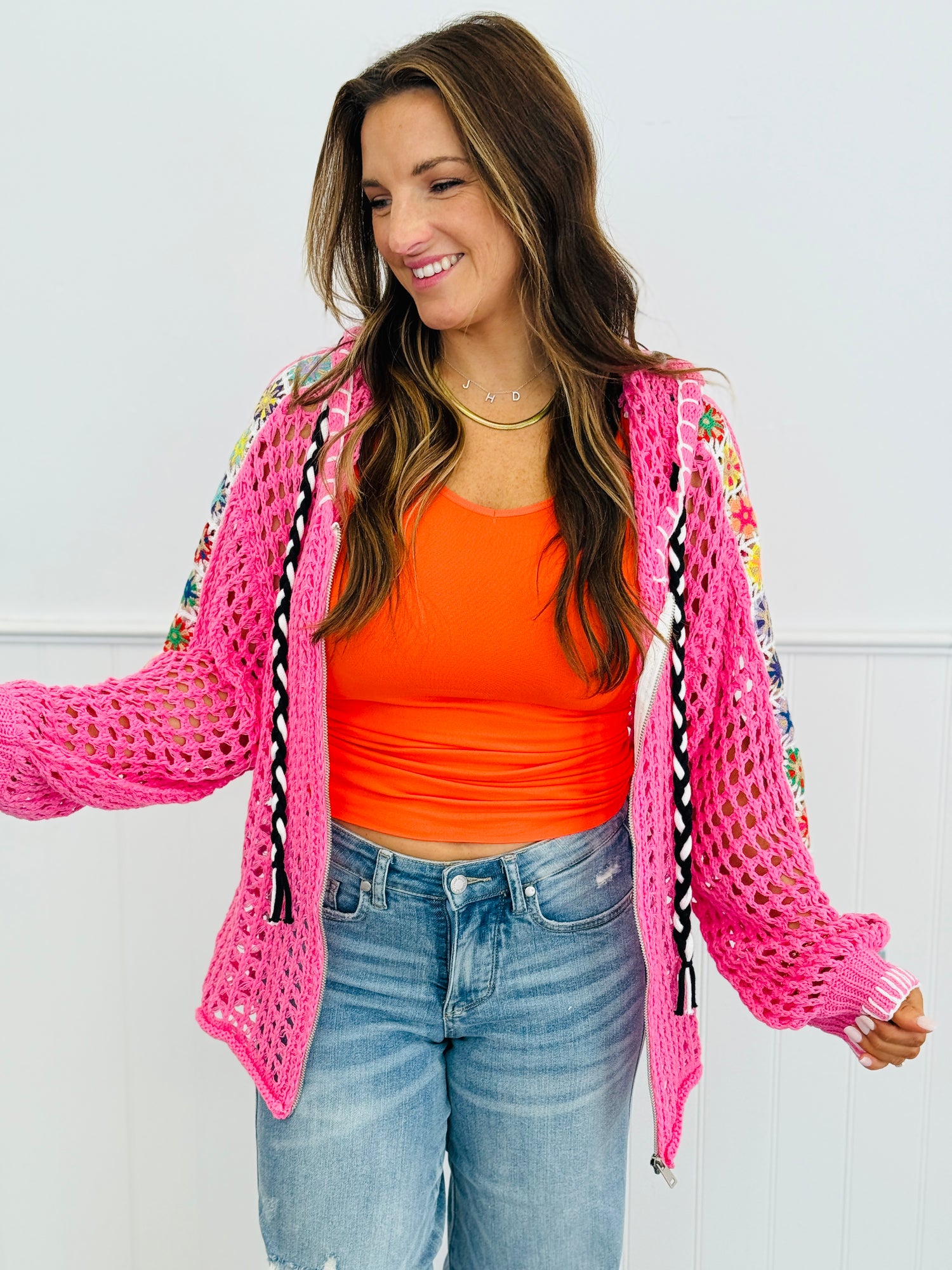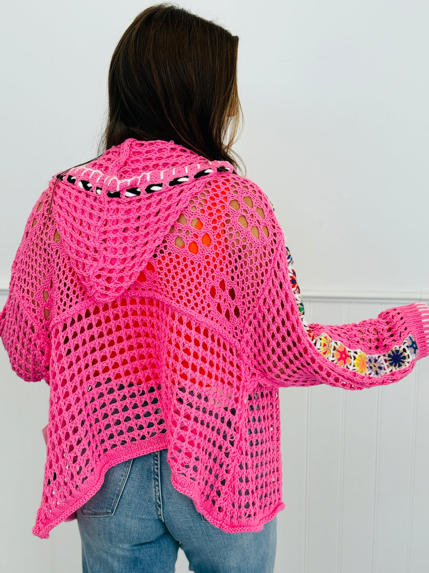 Presenting the super cute and versatile POL Open Weave Zip It Hoodie Cardi Top. Features include a V-neck, long balloon sleeves, front zip-up closure, attached hoodie with drawstring and contrast multi-colored granny squares on the sleeves.
