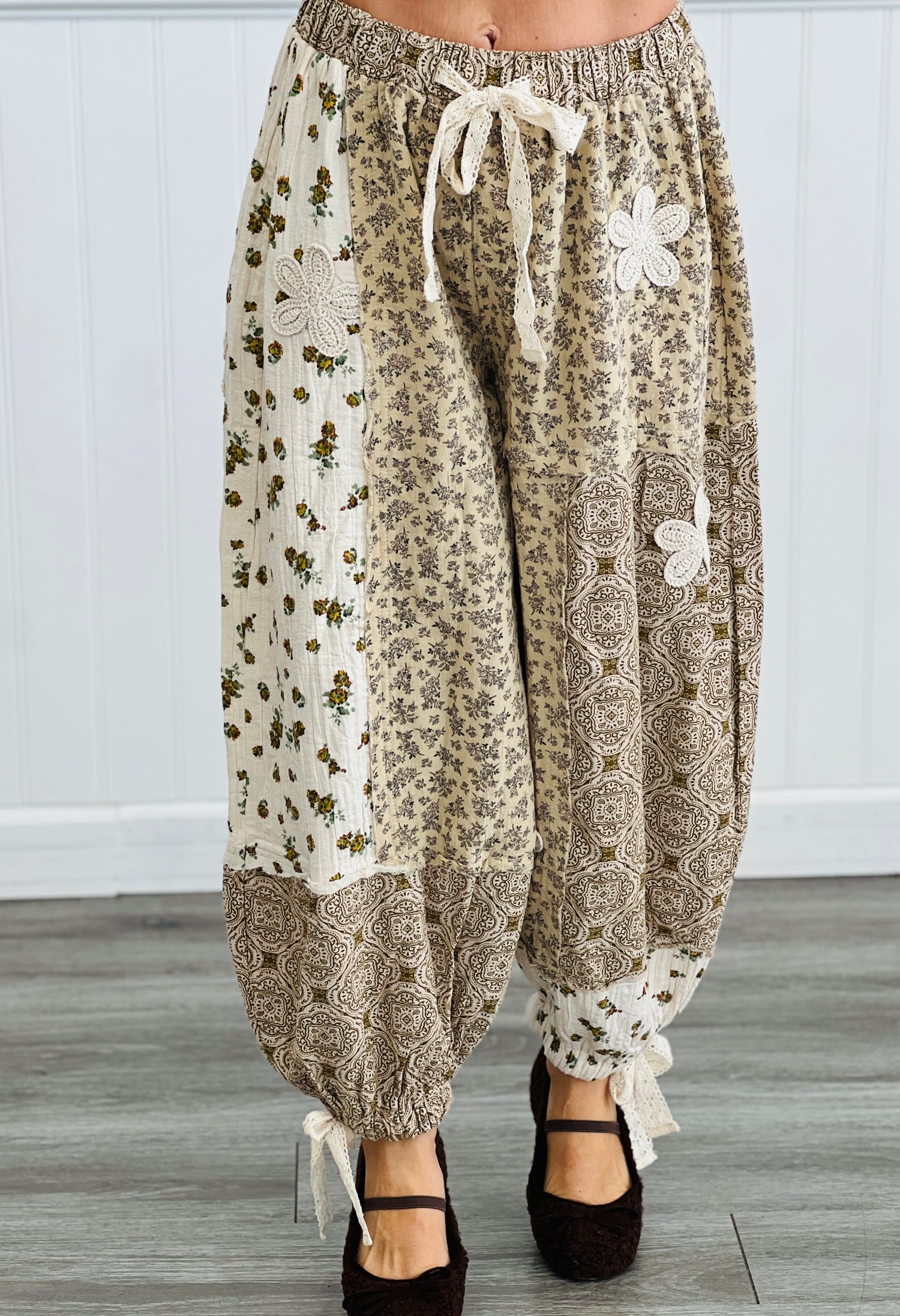 Step into comfort with a playful twist in the POL Sand Multi Floral Patchwork Pants. Featuring a pull-on elastic waist with waist tie, wide legs, crochet lace flower patches, contrast patchwork detail, pockets and woven floral print. Perfect for lounging or casual outings, these pants bring a fresh, fun vibe to your everyday wardrobe.