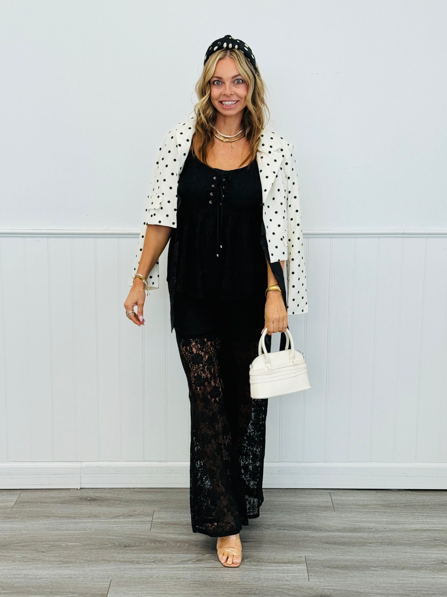 Introducing the sensational Polka Dot Satin Tie Jacket! Features include a front sash tie closure, a deep-v plunging neckline, long sleeves and a contemporary waist length silhouette. Perfect match to pants BOT6879.