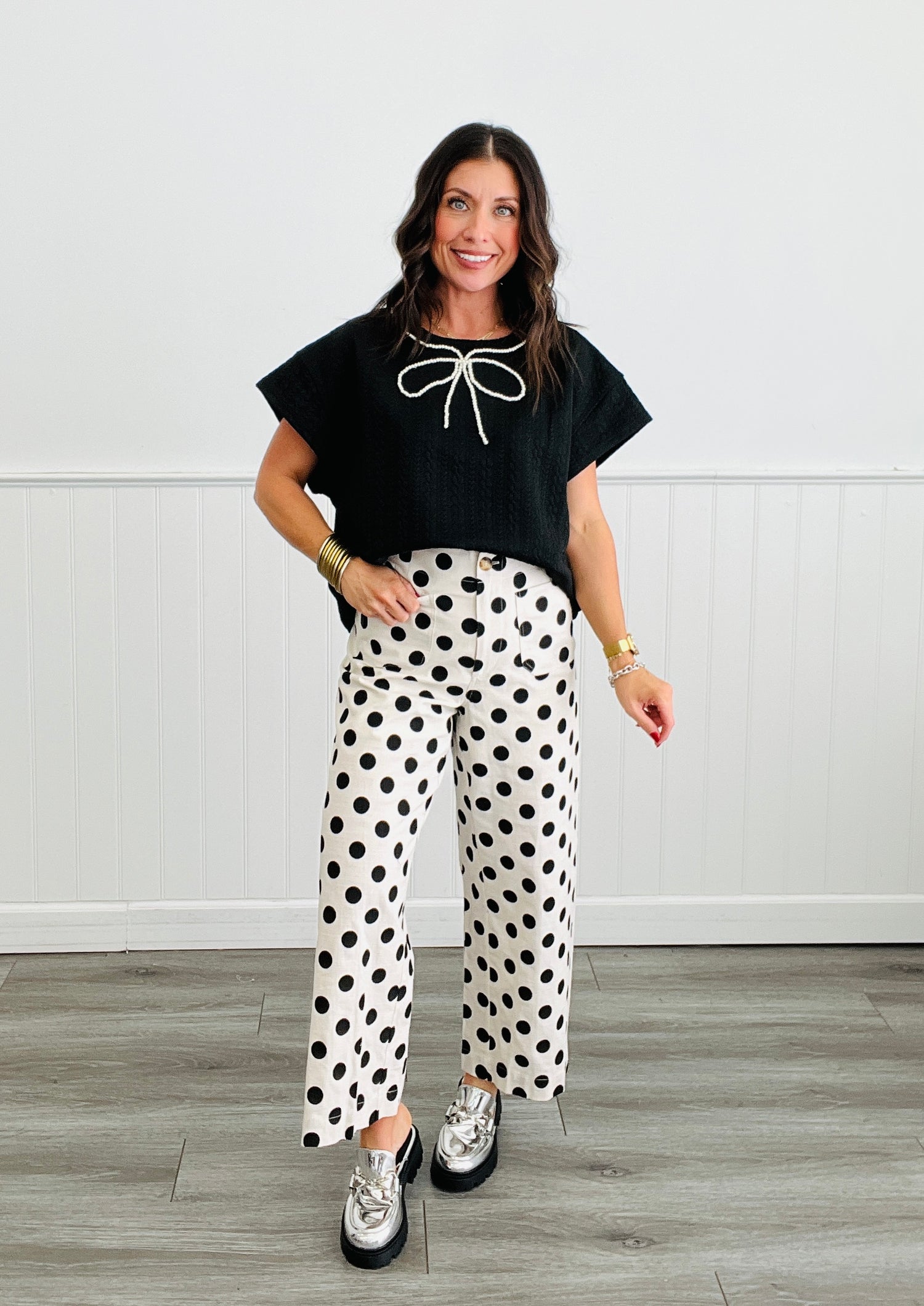 Add a playful element to your look wearing these super cute Polka Dot Wide Leg Pants! Features include an ivory background with black polka dot print, button & zipper closure, front and back pockets and an elastic waist in the back for the perfect fit.