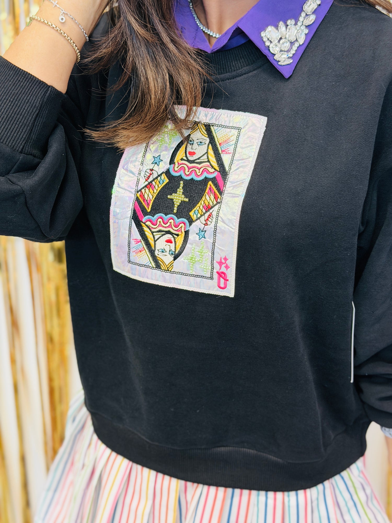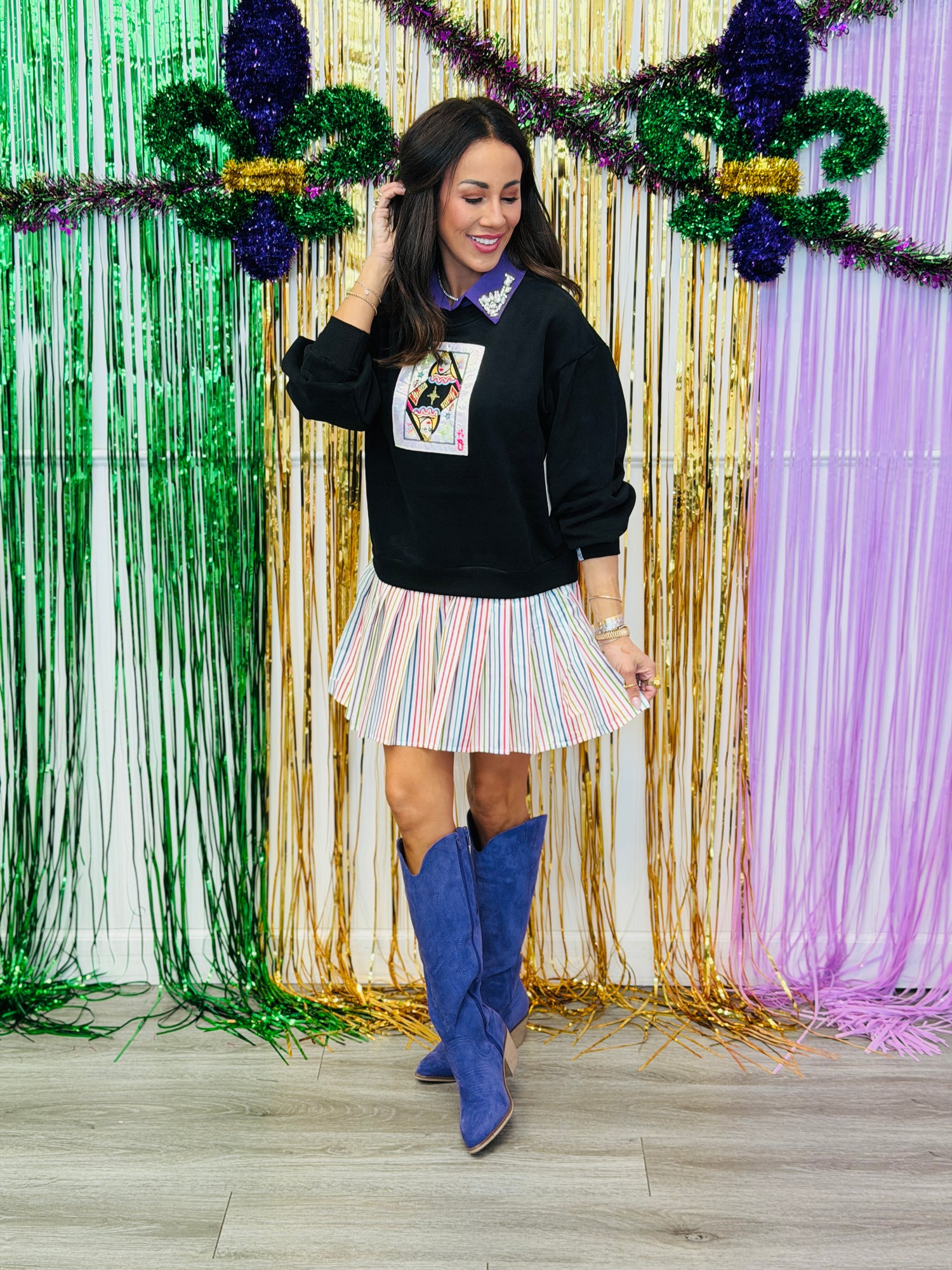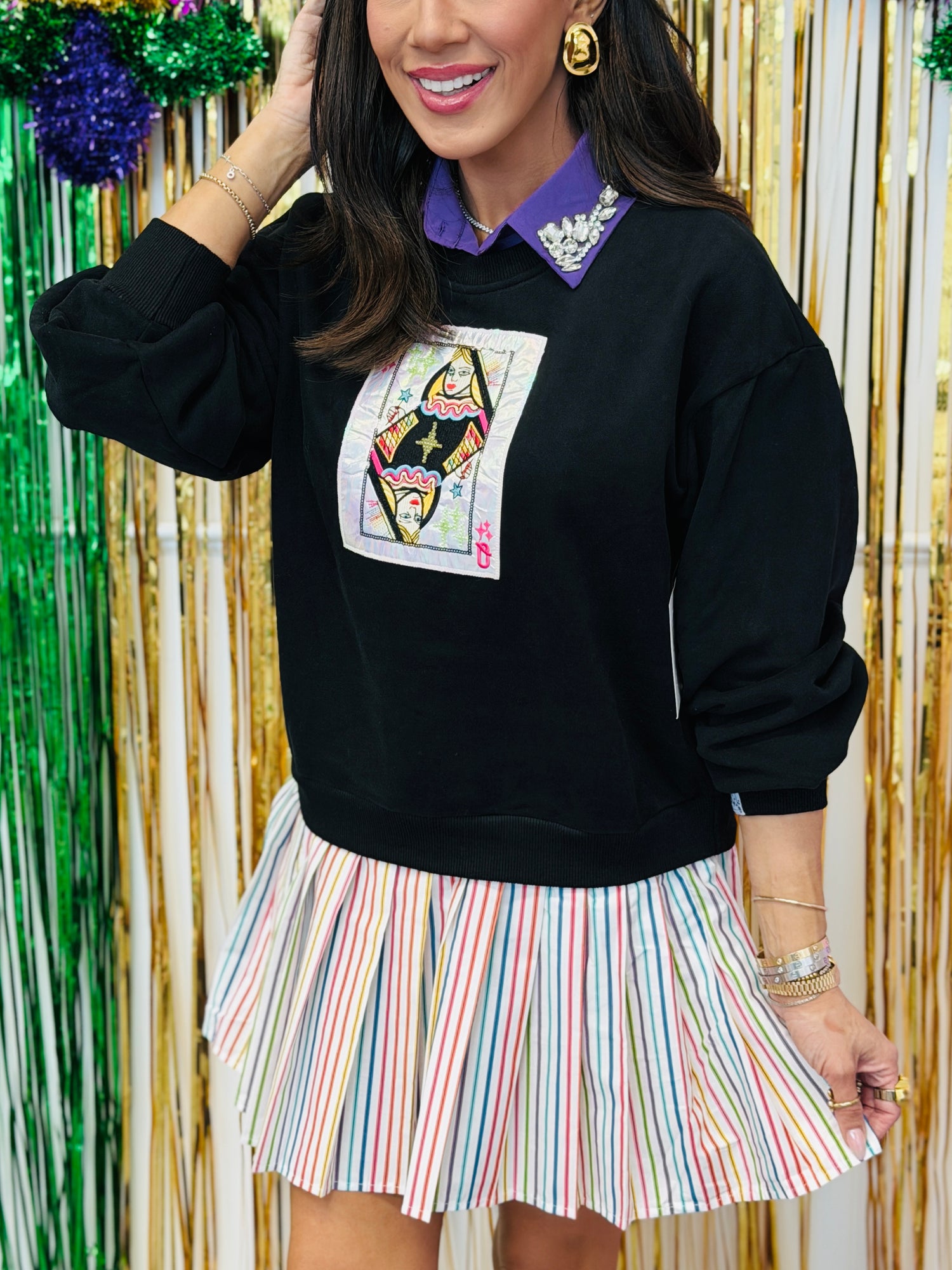Shine bright in this Queen Of Sparkles Black Card Logo Pleated Mini Dress, where luxury meets playful style. Featuring a bold black card logo on a cozy sweatshirt fabric, this dress combines comfort with statement-making flair. The striped multi-pleated bottom adds dynamic movement and dimension, creating an eye-catching silhouette that transitions effortlessly from day to night. Perfect for anyone who refuses to blend in, this mini dress celebrates confidence and sparkle in equal measure.
