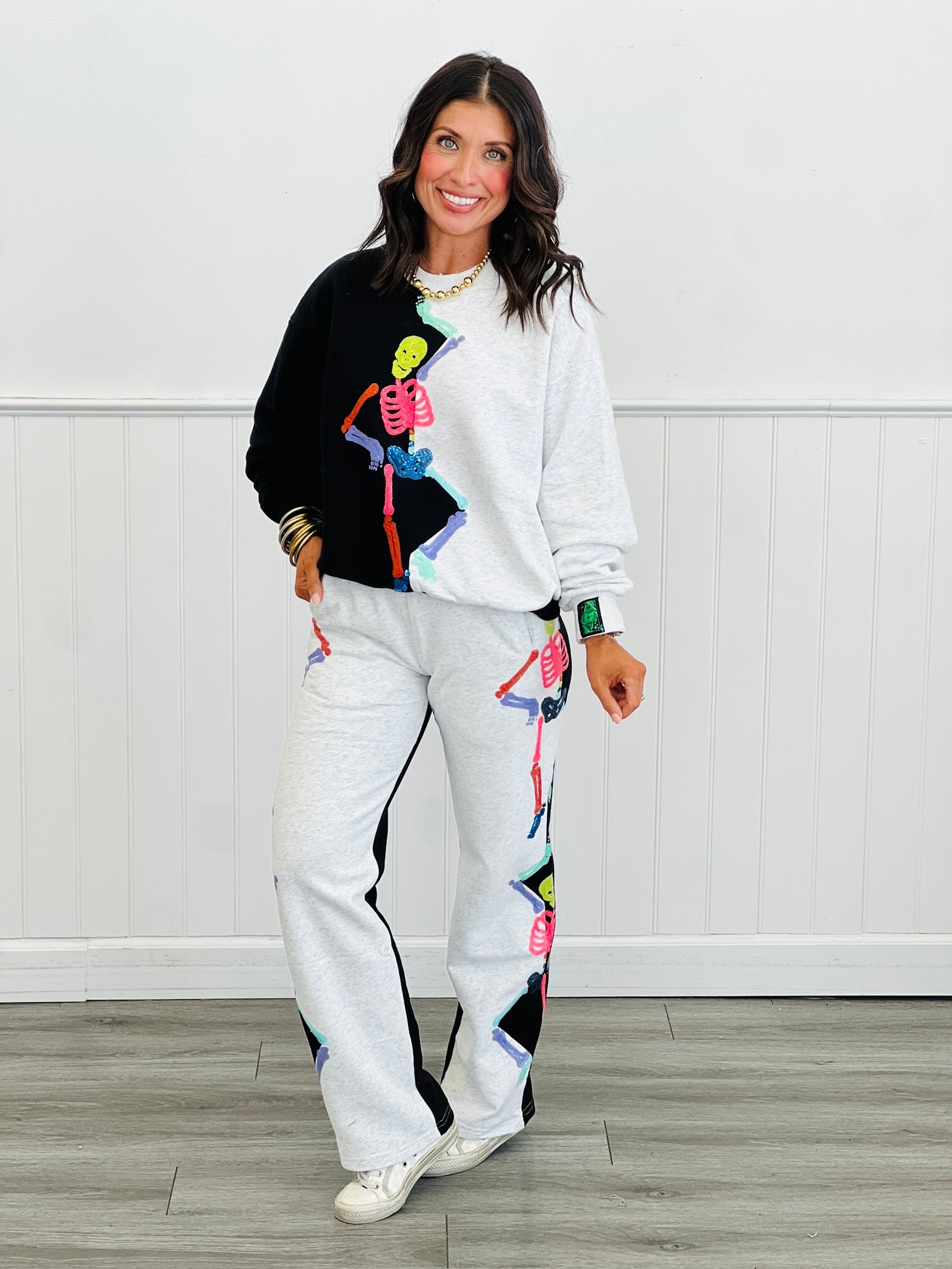 Turn heads and light up every room with the Queen Of Sparkles Black/Grey Colorblock Sequin Skeleton Pants. Featuring dazzling sequins in a bold skeleton design, these pants blend edgy style with festive fun. Perfect for parties or making a statement on any night out, their colorblock pattern adds extra flair. Available in regular and plus sizes, they bring sparkle and attitude to any wardrobe. Get ready to shine and own your sparkle!