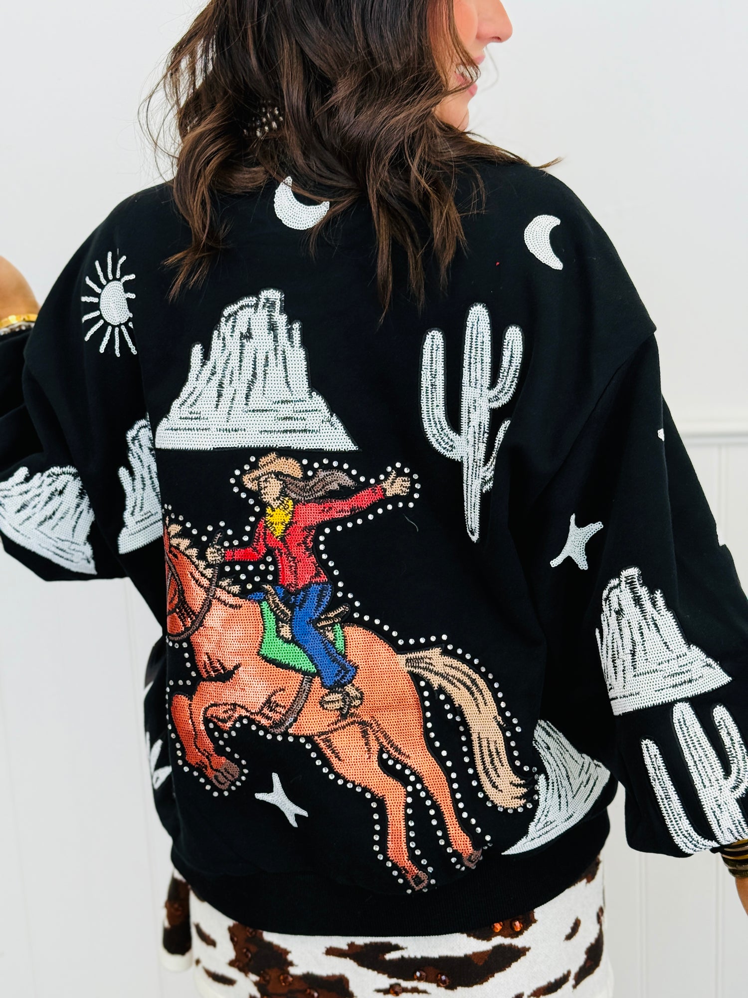 Queen Of Sparkles Black & White Bucking Cowgirl Sweatshirt (Reg. and Plus)