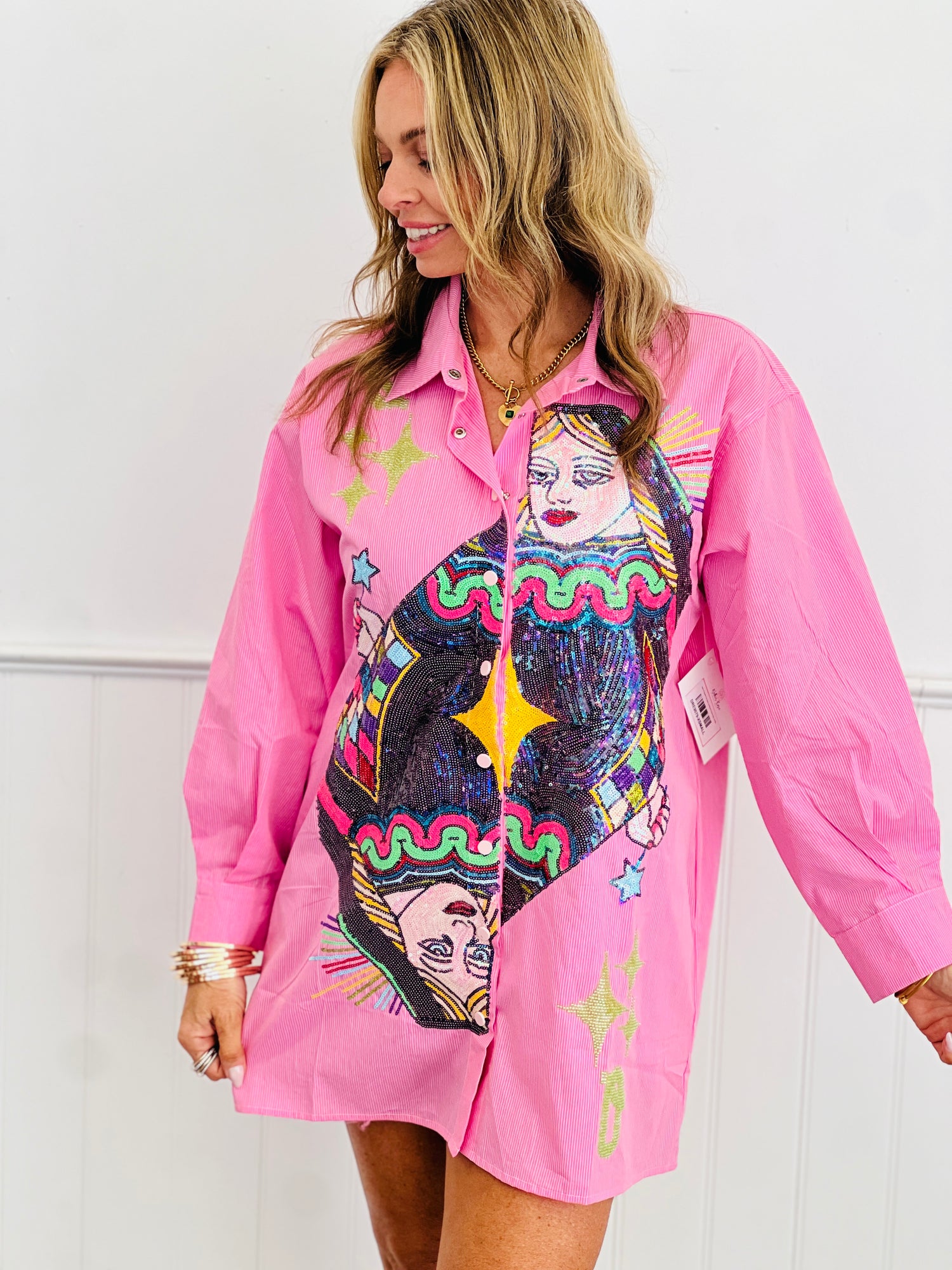 Queen Of Sparkles Pink Queen Card Button Up Dress (Reg. and Plus)