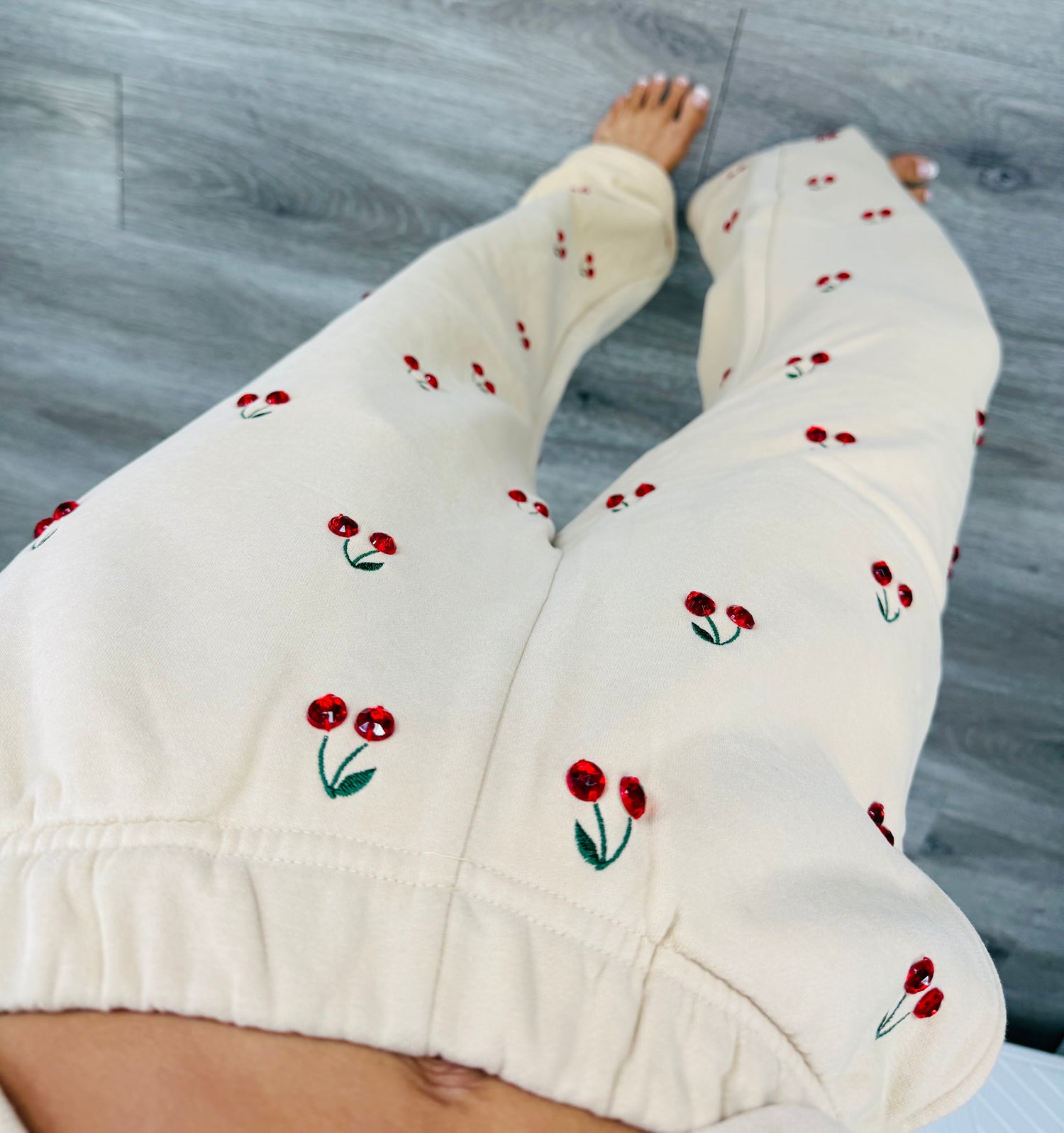 These tan elastic waist sweatpants bring fun and flair with embroidered and jeweled cherries scattered all over. Designed with comfy side pockets and a stretchy waistband, they’re perfect for lounging in style or making a playful statement. Embrace comfort with a sparkling twist!