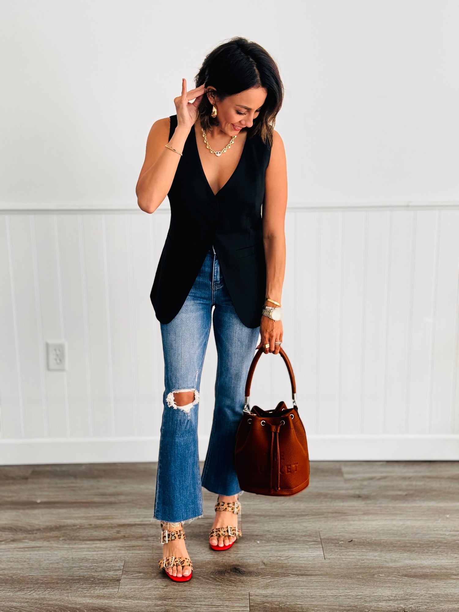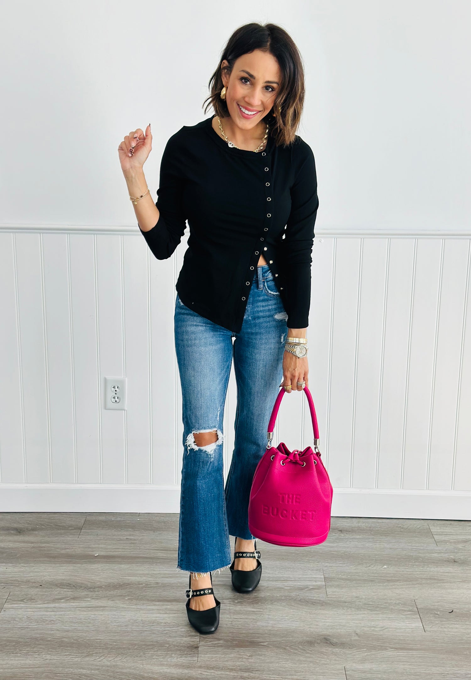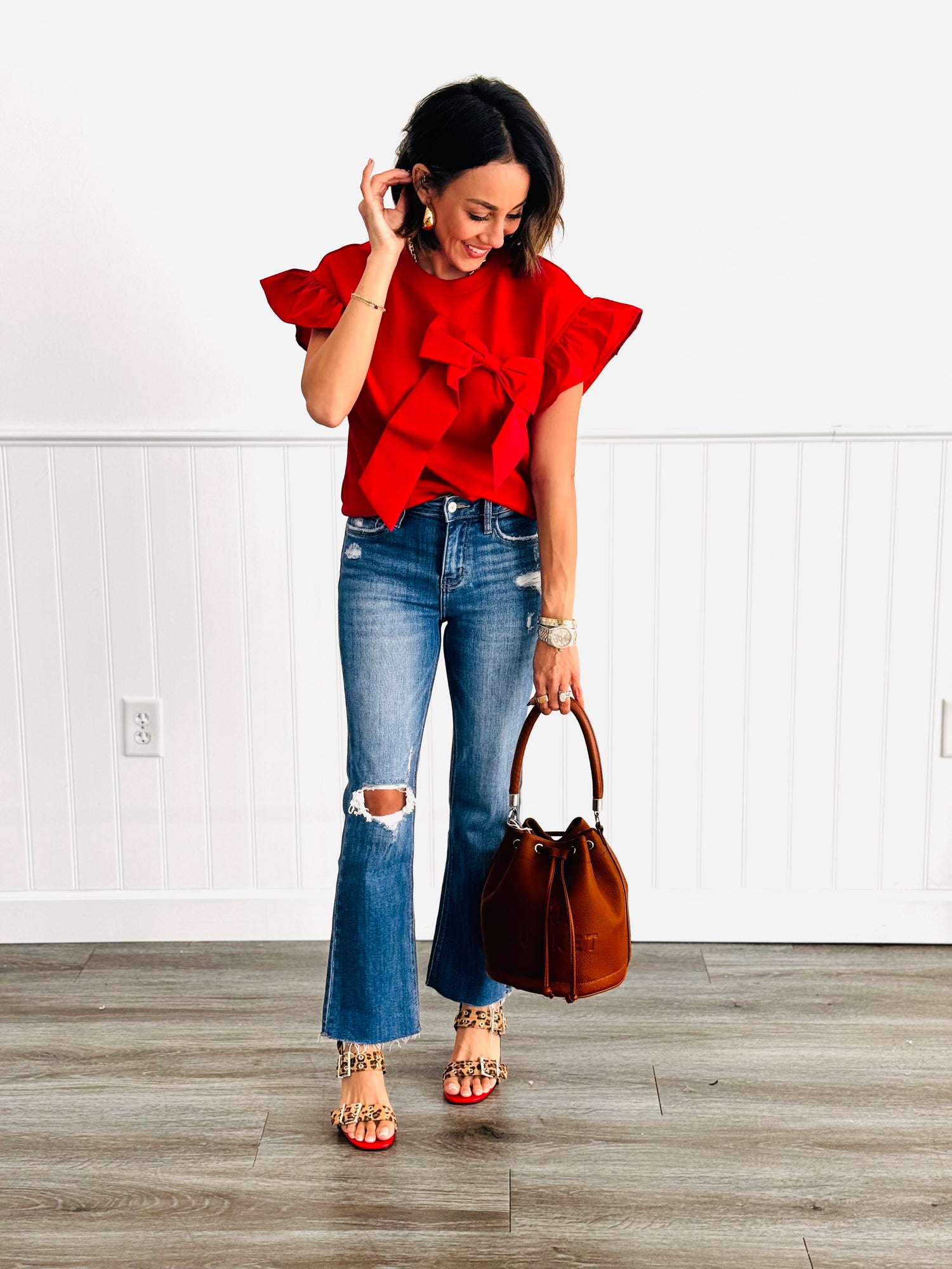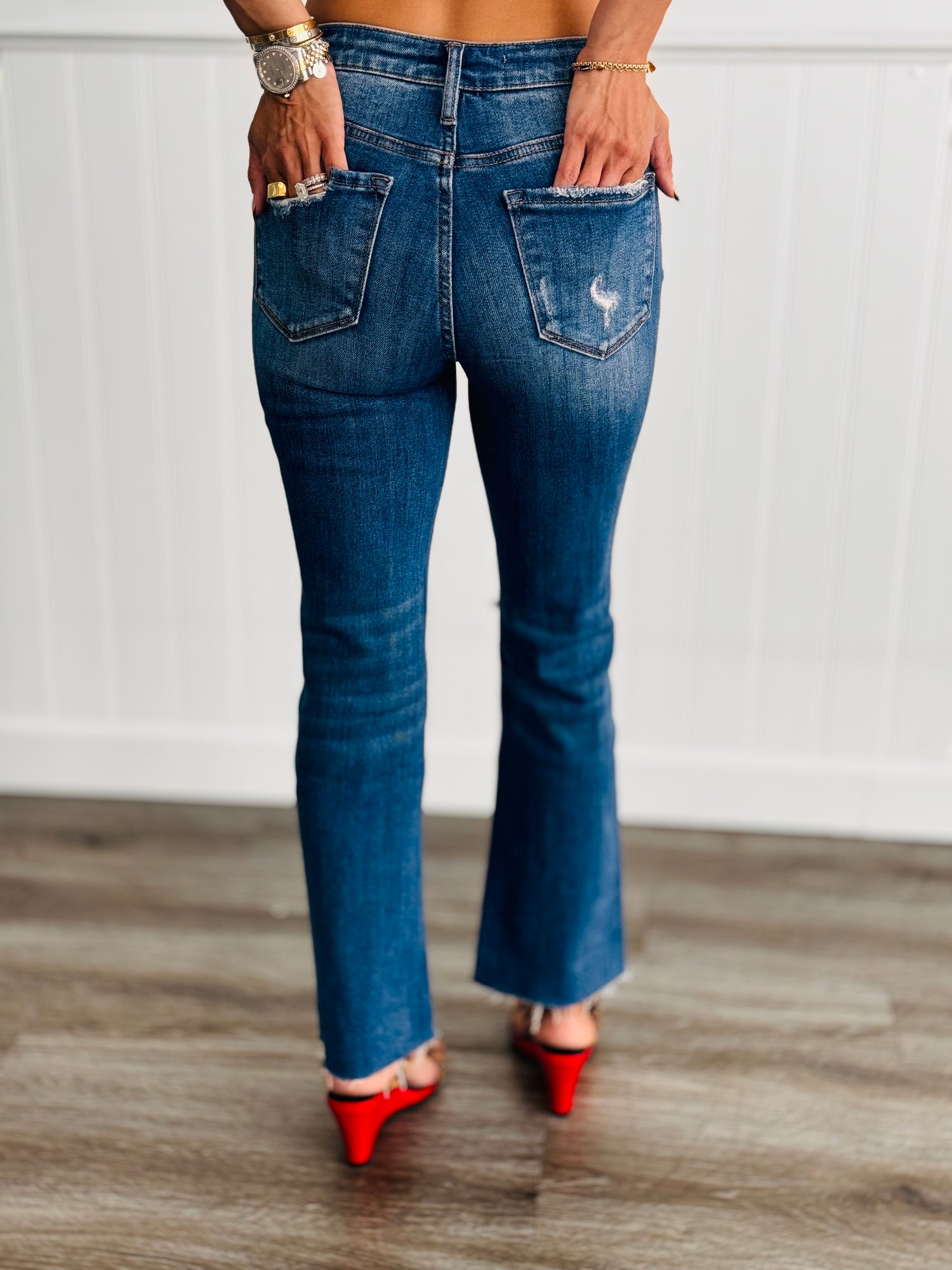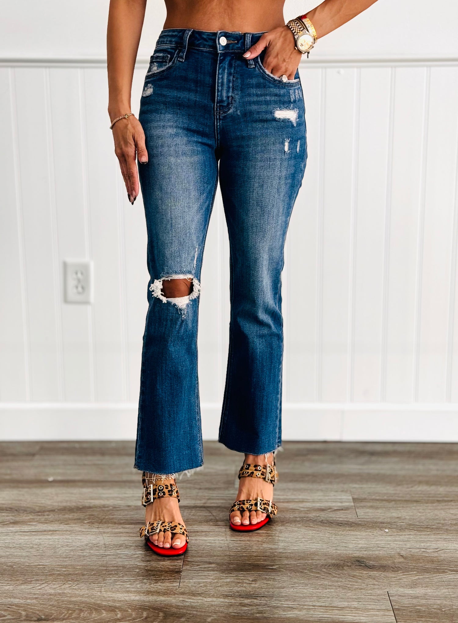 The exceptional structure, achieved by the high rise tummy control waist and kick flare cropped legs, combined with the comfort stretch denim fabrication and on-trend distressed knee detailing make these Receptive (medium blue) denim jeans the envy of the closet.