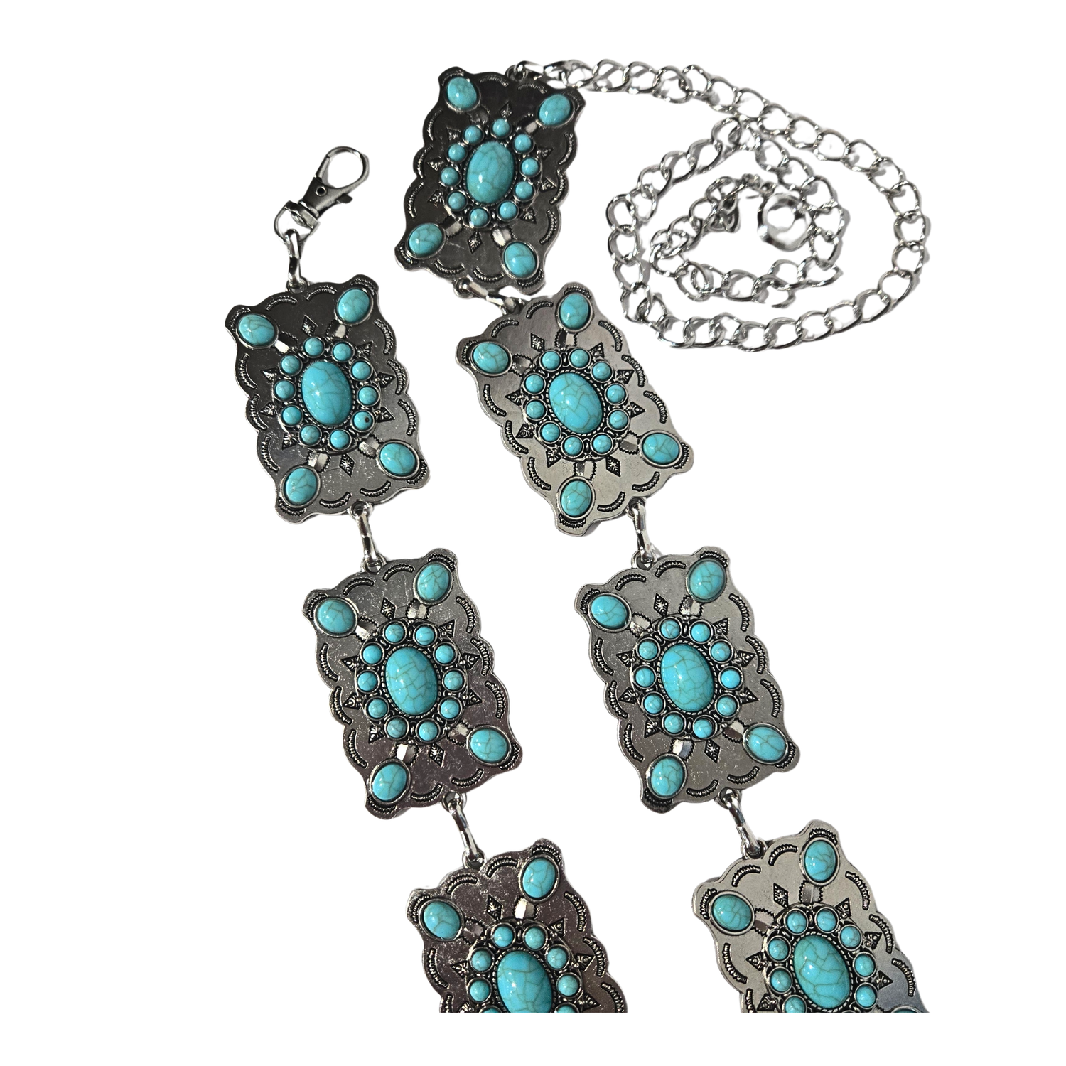 Make a statement with this Rectangle Silver & Turquoise Concho Belt. Featuring striking turquoise studs in a classic western concho design, it's the perfect accessory to showcase your bold, unique style.