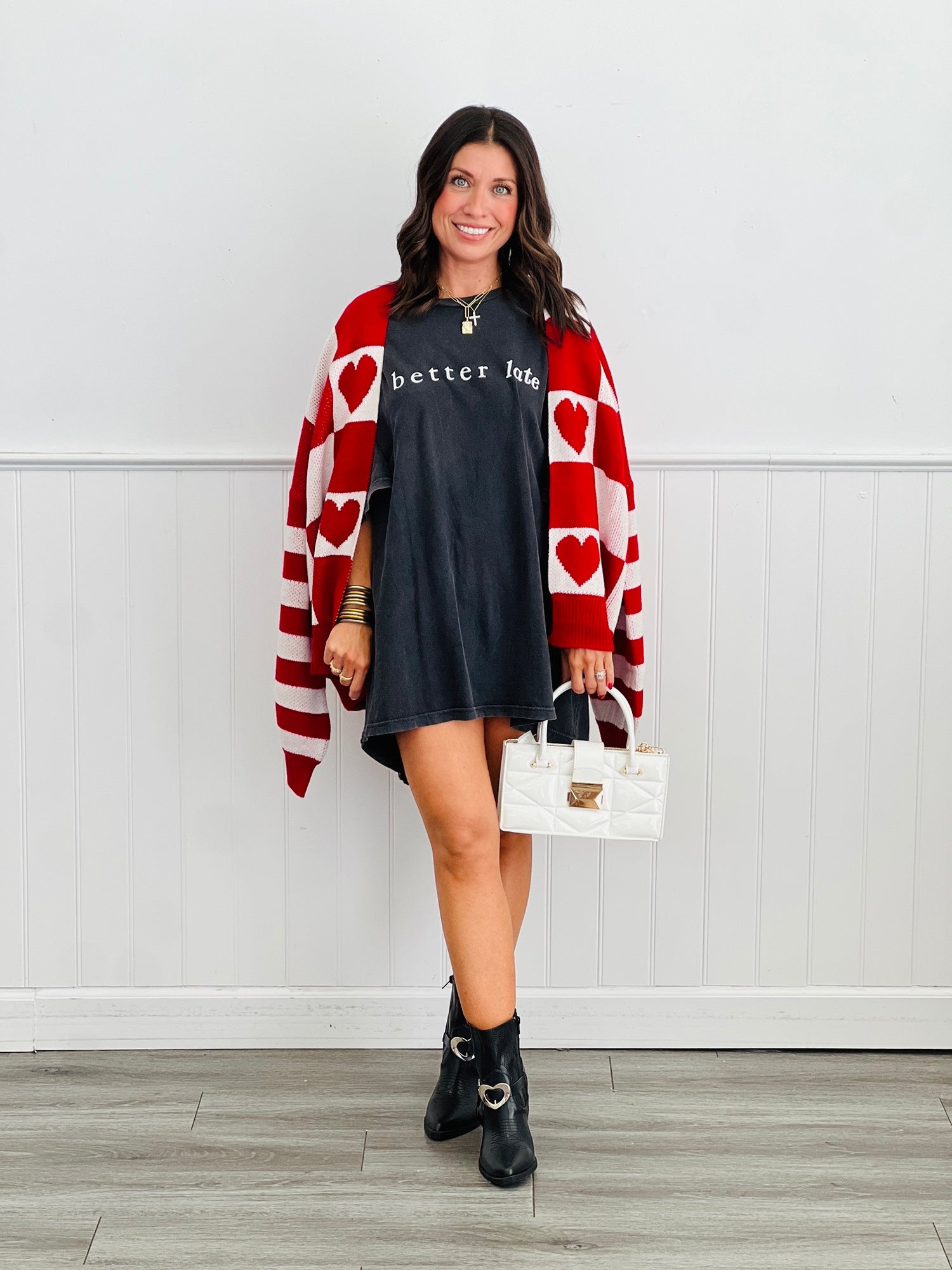 Celebrate the season of love in cozy style with this Red Heart Checkered Sweater Cardigan. Features include long balloon sleeves, dropped shoulders, open front, contrast solid ribbed cuffs & hemline and a red & white checkered heart pattern.