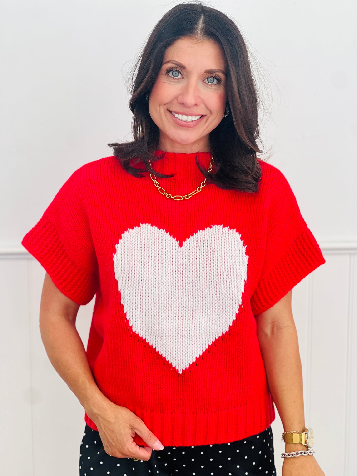 Add a splash of heart-warming fun to your wardrobe with our Red/Ivory Heart Short Sleeve Sweater! Featuring rib banded high neck, cuffs & hemline, a waist length relaxed silhouette and a large contrast heart graphic on the front.