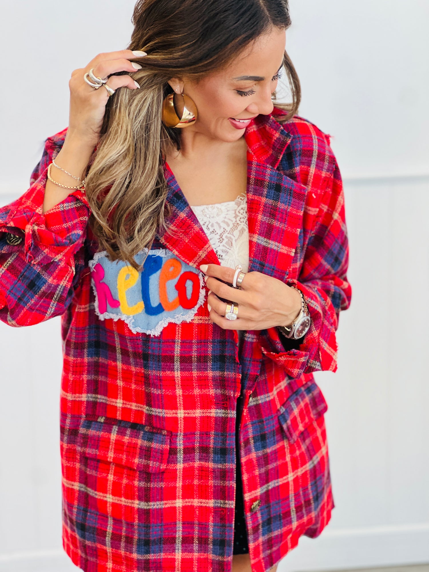 Get ready to say "hello" to style with this Red Multi Hello Patch Blazer! Featuring a colorful letter patch on the chest side, this blazer adds a playful touch to any outfit. Complete with front pockets, it's both functional and fashionable. Say goodbye to boring blazers and hello to this one-of-a-kind piece!