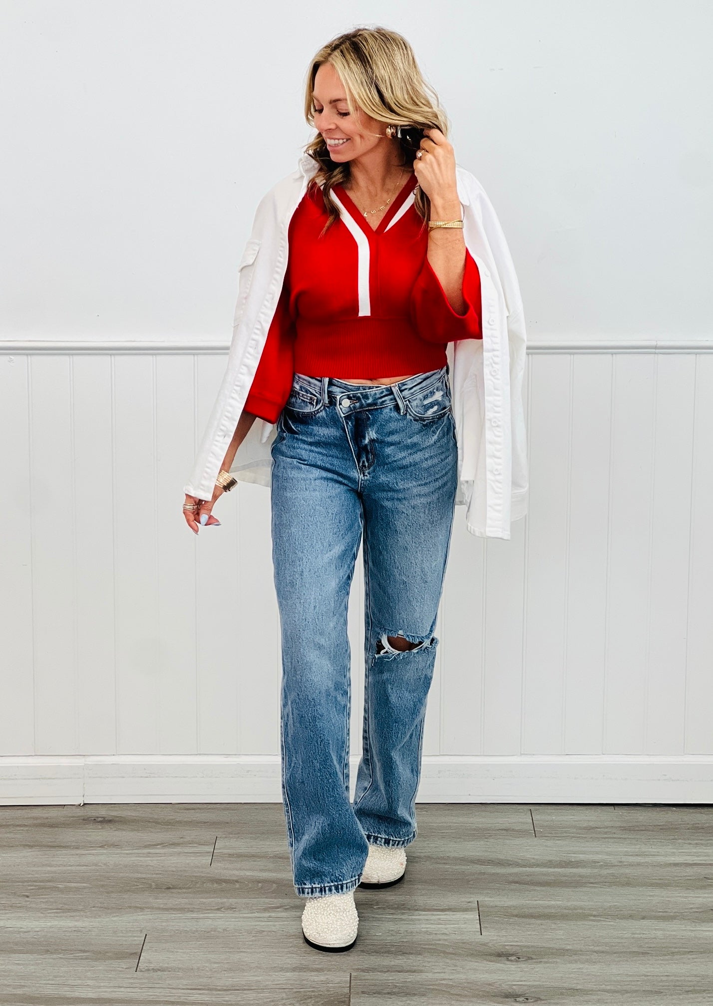 Rock a sporty-chic vibe in this relaxed-fit V-neck top! The bold contrast trim frames the neckline beautifully, while drop shoulders and wide ribbed detailing keep things comfy and effortless. Cropped just right, it's your new go-to for pairing with high-rise jeans or bottoms. Whether you're running errands or grabbing coffee, this collared essential delivers that perfect balance of laid-back cool and polished style. Available in regular and plus sizes.