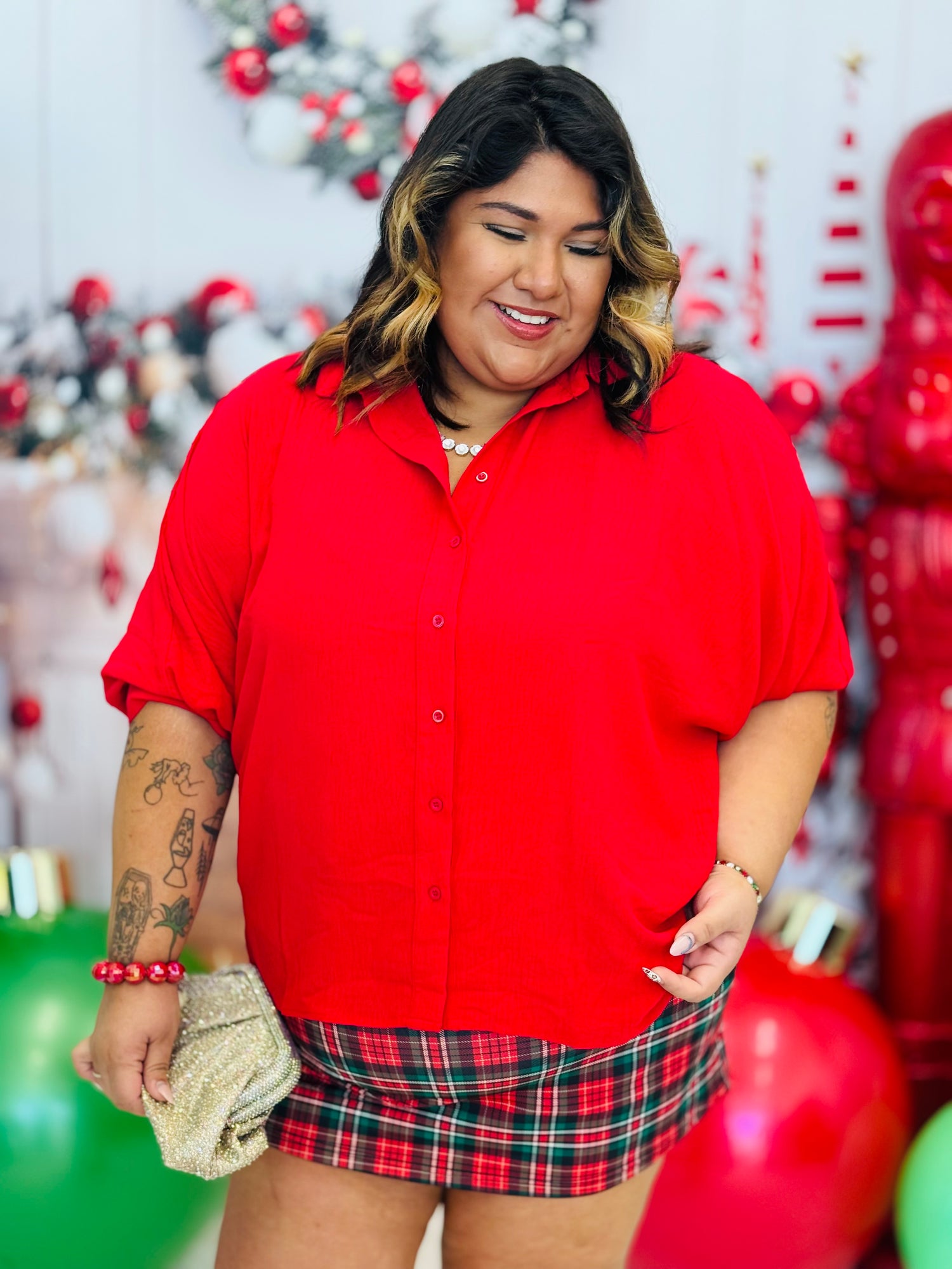Slay in style this holiday season with the Sloane Button Up Top in Red- a perfect blend of chic and casual with its oversized, half-sleeved design and classic collar. Get ready to turn heads with this must-have blouse for the season!