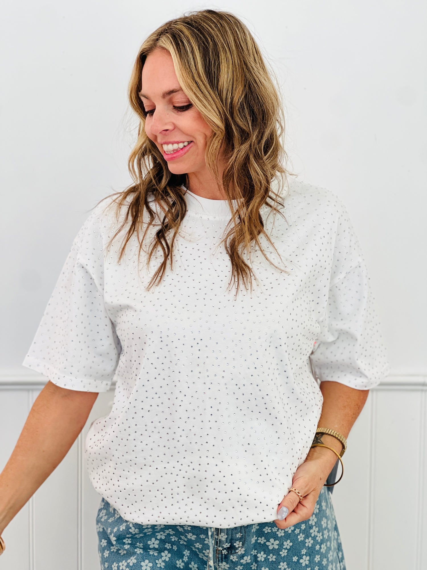 Sparkle and shine in our Rhinestone Short Sleeve Top, perfect for any occasion! This playful top features eye-catching rhinestone detailing and a comfortable short sleeve design. Add a touch of glam to your wardrobe today!