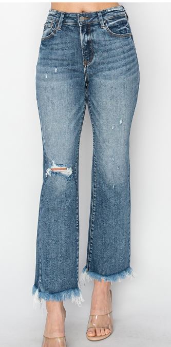 Super cute on-trend dark washed "Best Keepin' It Trendy Bootcut Jeans" will have you entering your busy day in style. These high-rise mildly distressed jeans feature a cropped flared leg with frayed hemline and traditional 5-pocket button and zip closure.