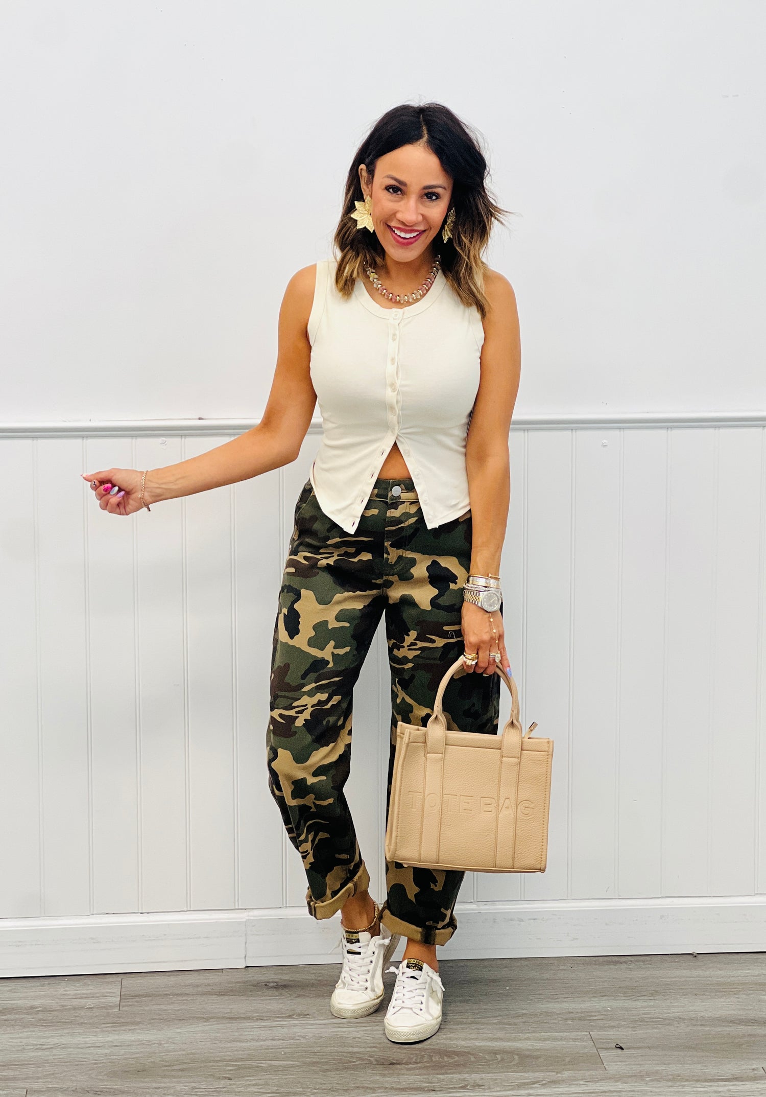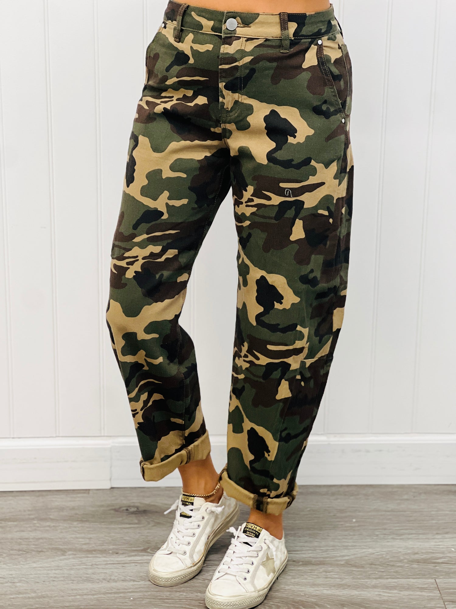 Get ready to add an on-trend fun element to your closet with these Risen Camo Into The Wild Roll Up Barrel Jeans! These super cute pants feature a high-rise fit and straight barrel cuffable legs, front and back pockets and front button & zipper closure.