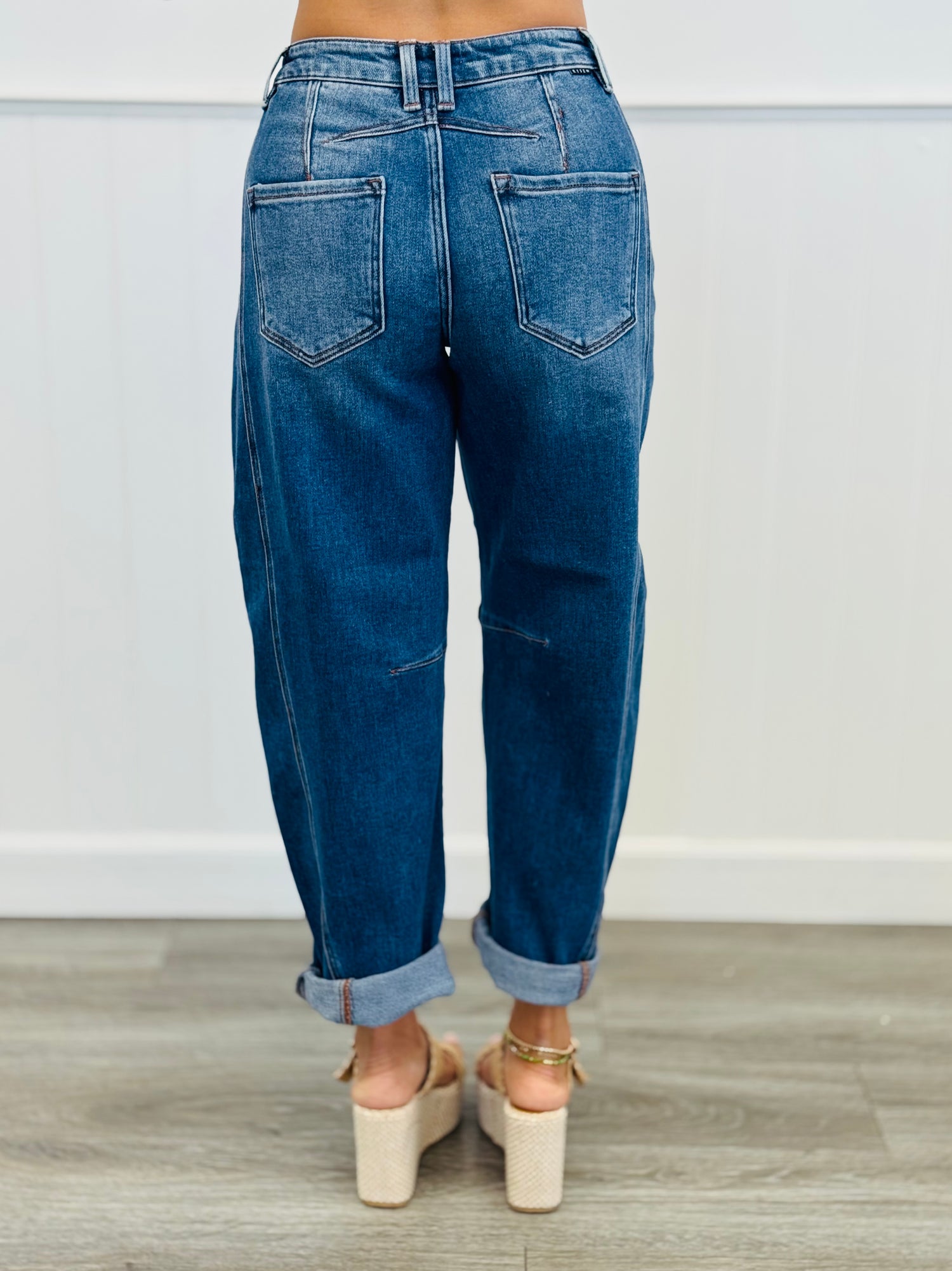 Cute and comfy high rise boyfriend barrel jeans feature a dark wash. These jeans can be cuffed or uncuffed for a versatile look plus the convenience of a traditional five-pocket, button and zipper design.