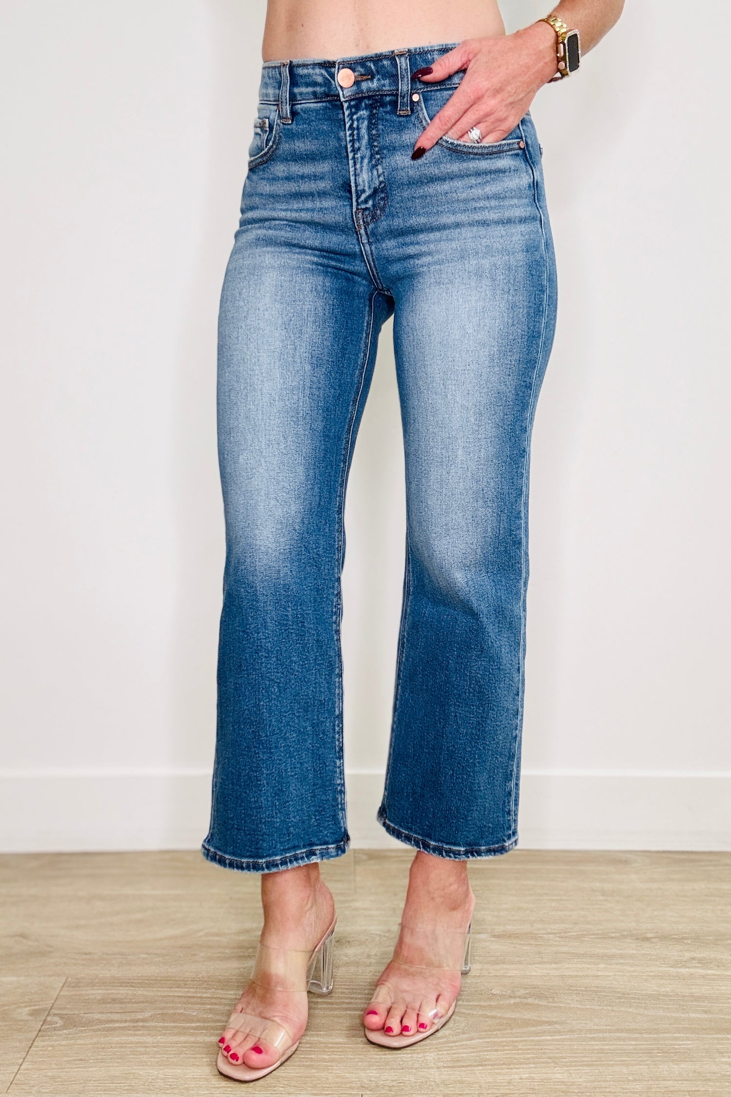 Get ready to look and feel fabulous today wearing our Risen Dark Tummy Control Cropped Jeans! These tummy control, mid-rise jeans provide a flattering fit, while the tummy control feature with elastic band gives you confidence that you look your best! Features include 5-pocket design, front button & zipper closure and wide cropped legs.