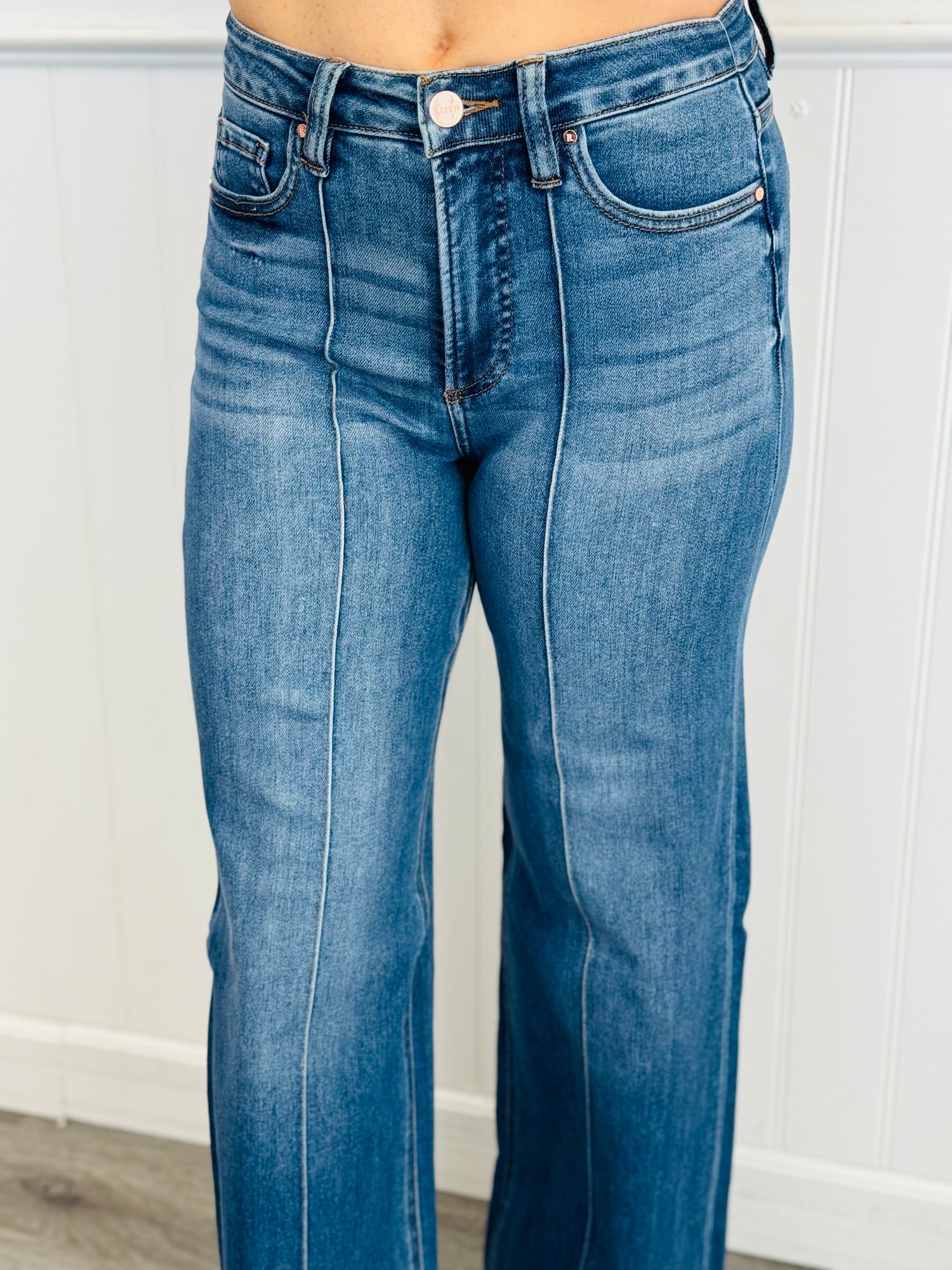 I’m Refresh your denim collection with our Risen Unbelievably You High Rise Pintuck Tummy Control Jeans in medium washed blue denim. The high rise, front pintuck detail , tummy control feature and wide at the ankles leg creates an interesting and flattering silhouette. Traditional five-pocket design with front button and zipper closure. Available in regular and plus sizes, these jeans offer trendy and effortless style.