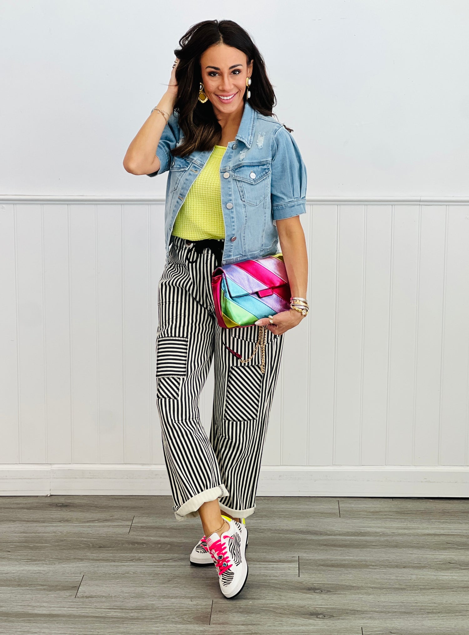 Cute and comfy very mildly distressed light washed blue denim jacket. This adorable jacket features short shirred puffed sleeves, chest flap pockets and front button-down closure. You can size up for an oversized fit, but we prefer our true size!