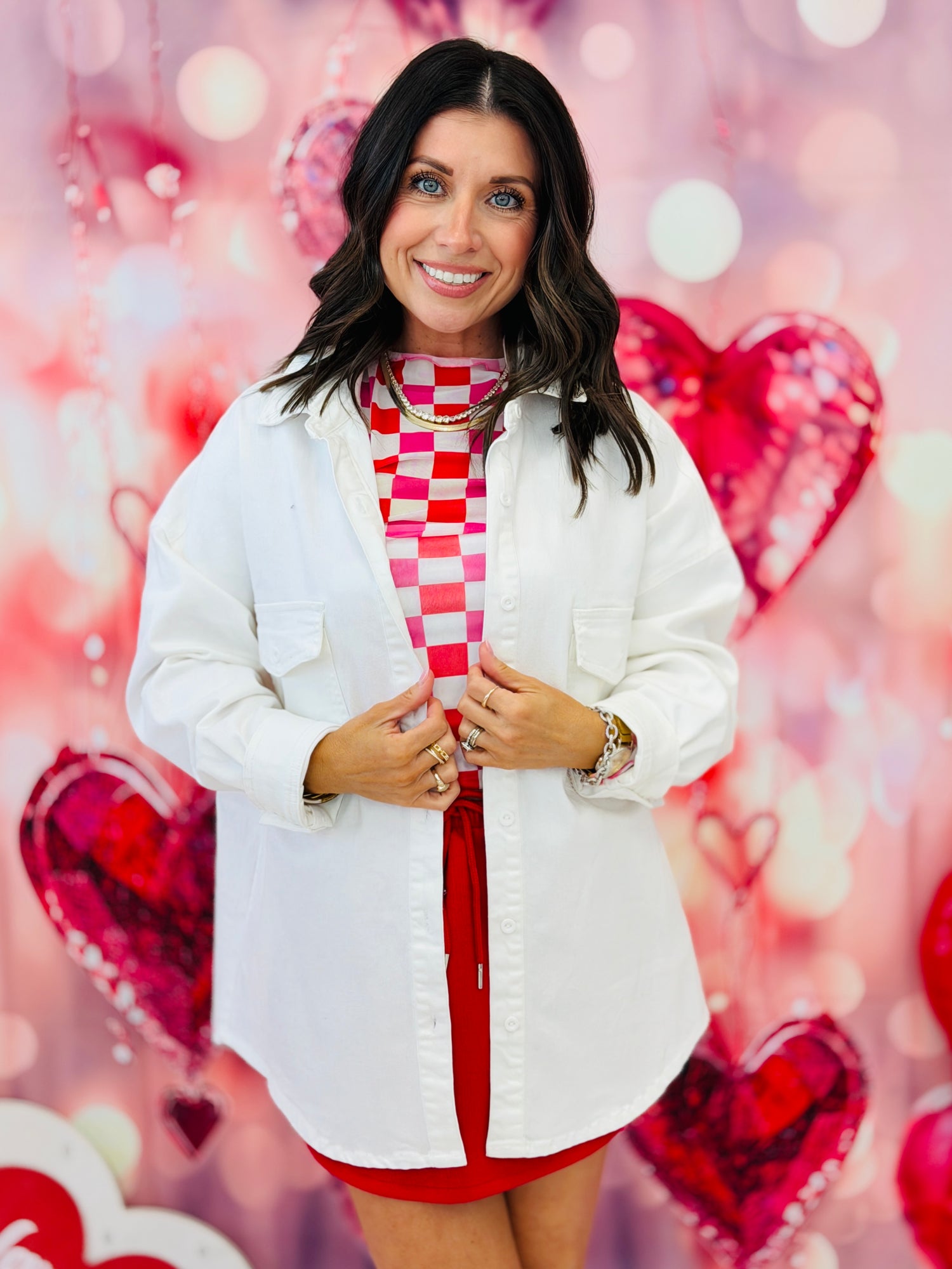 Risen oversized white shacket/shirt features a button down front closure, long sleeves with button cuffs, inset collar. rounded hemline, button flap chest pockets and oversized silhouette.