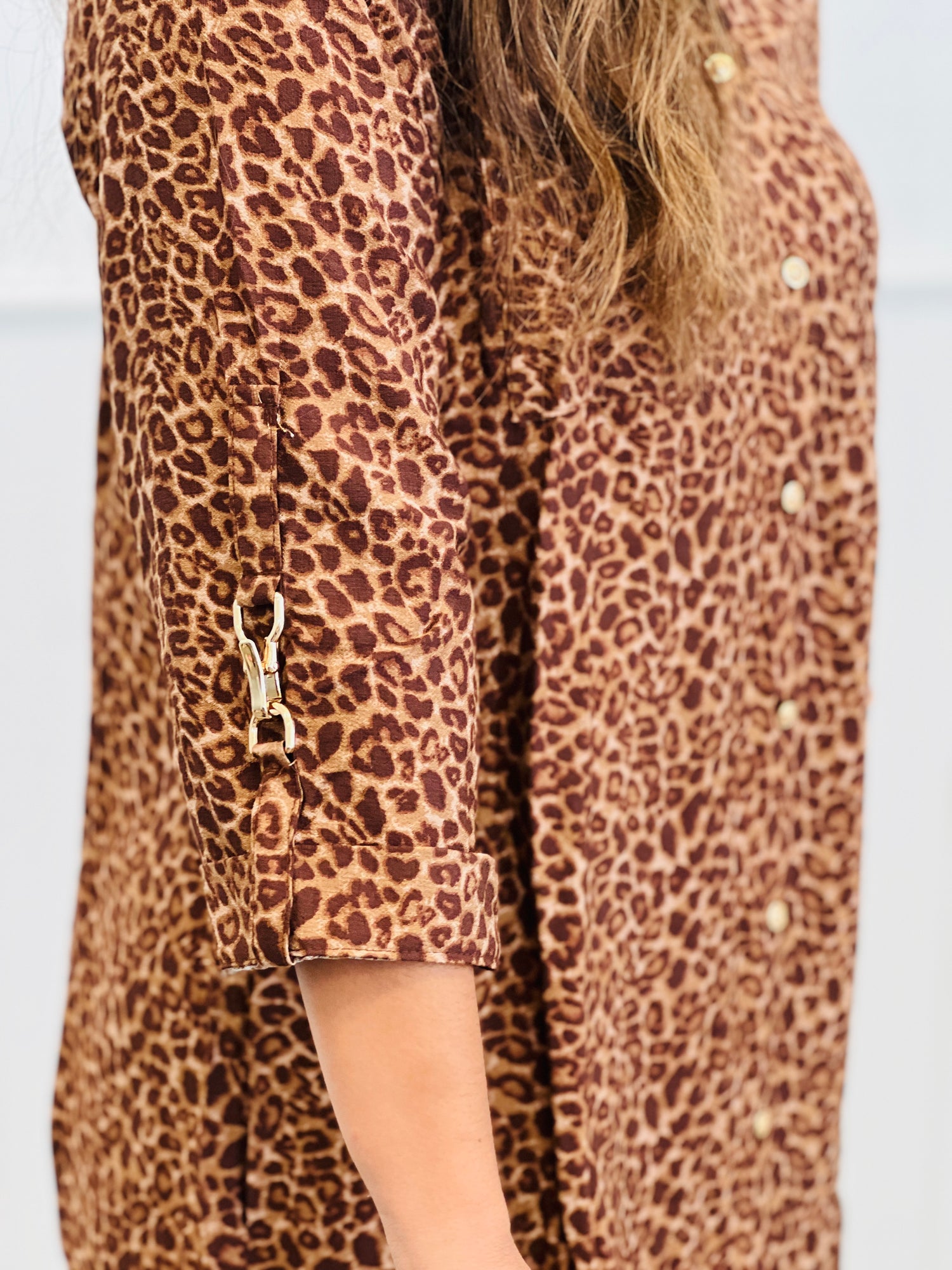 The Leopard Button Down Mini Dress is a playful twist on a classic silhouette, featuring shiny gold buttons and a crisp collar. Its standout metal clip-on sleeves add a fun, unexpected detail that lets you customize your look. This dress is perfect for adding a bit of sparkle and personality to your wardrobe.