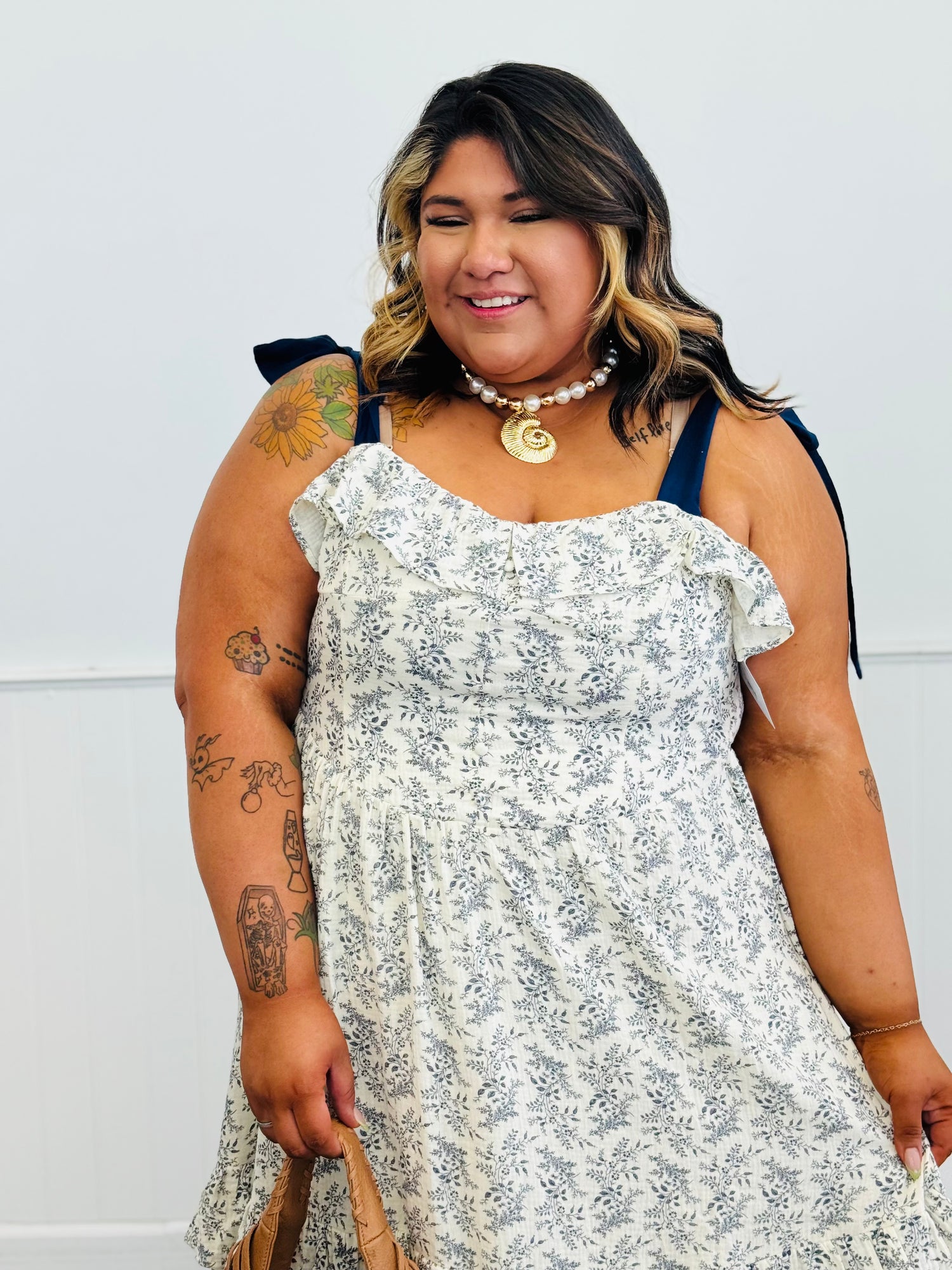 Precious ivory Ruffled Indigo Print Maxi Dress. Features include a ruffled sweetheart neckline, contrast ribbon tie shoulder straps, smocked back, side zipper and ruffled flowy maxi skirt.