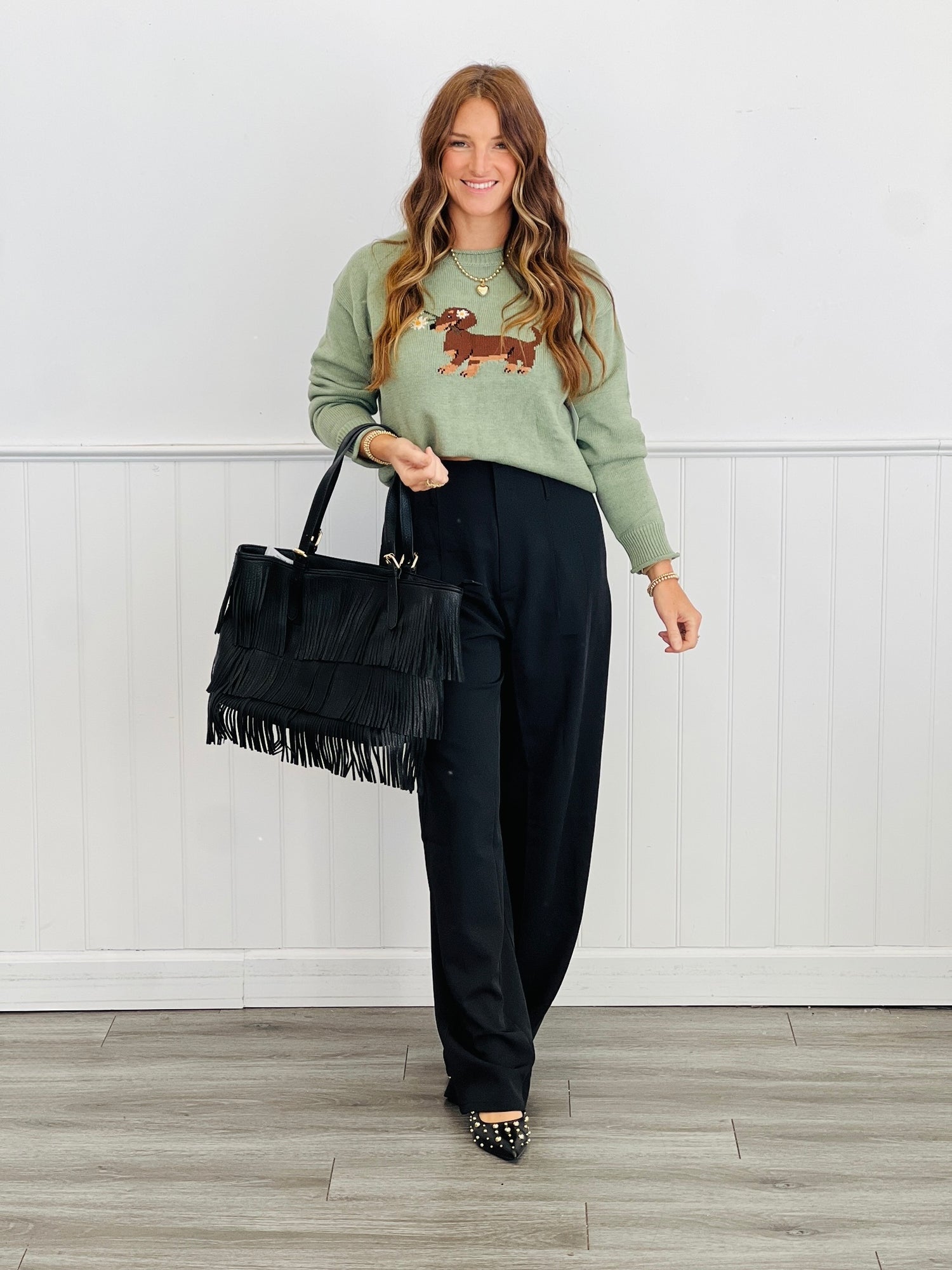Add a playful touch to your outfit with the Sage Doggy Graphic Sweater Top. This long-sleeve sweater features a charming wienie dog holding flowers in its mouth, blending cozy warmth with an irresistibly cute design that’s sure to brighten your day.