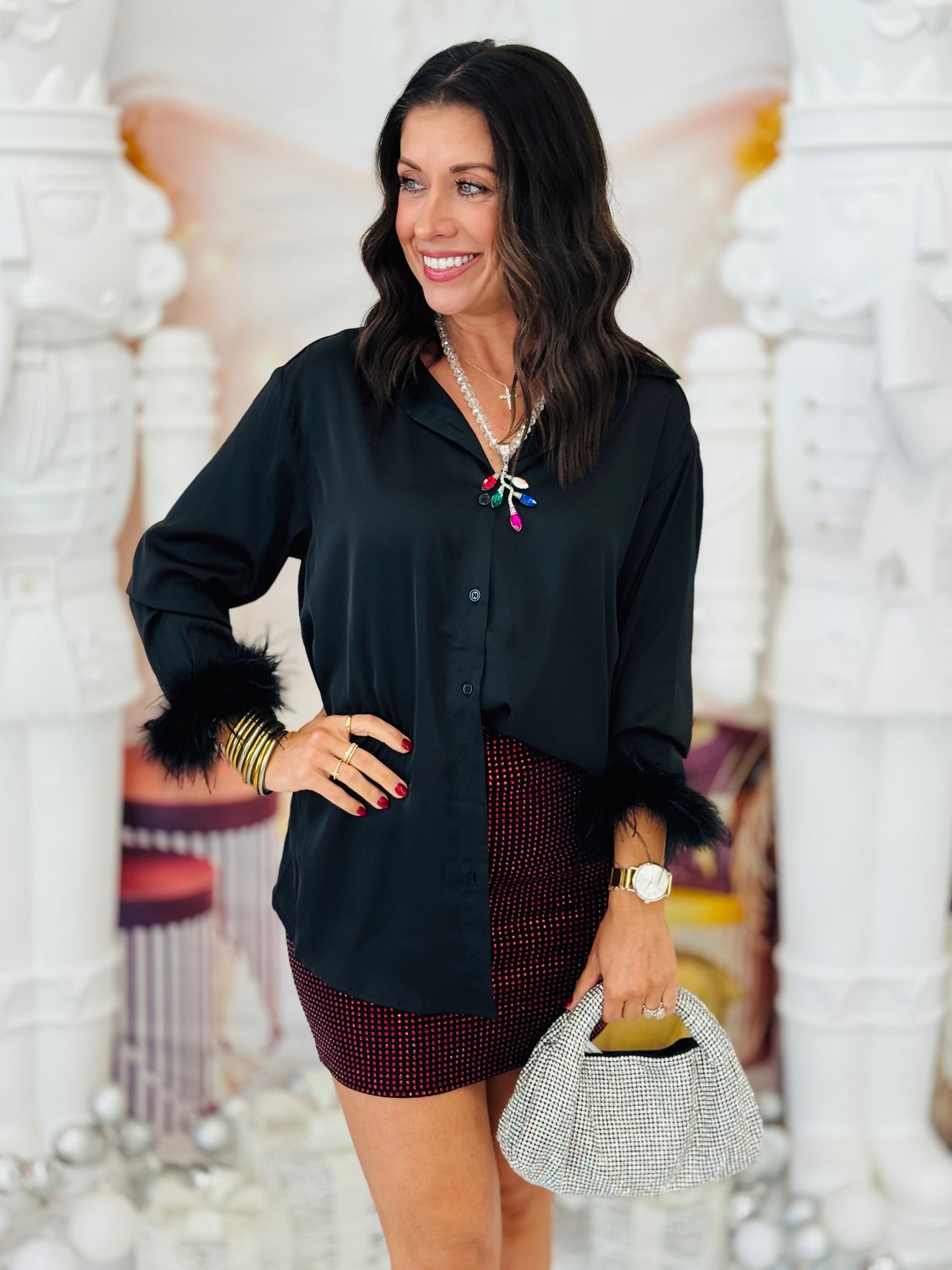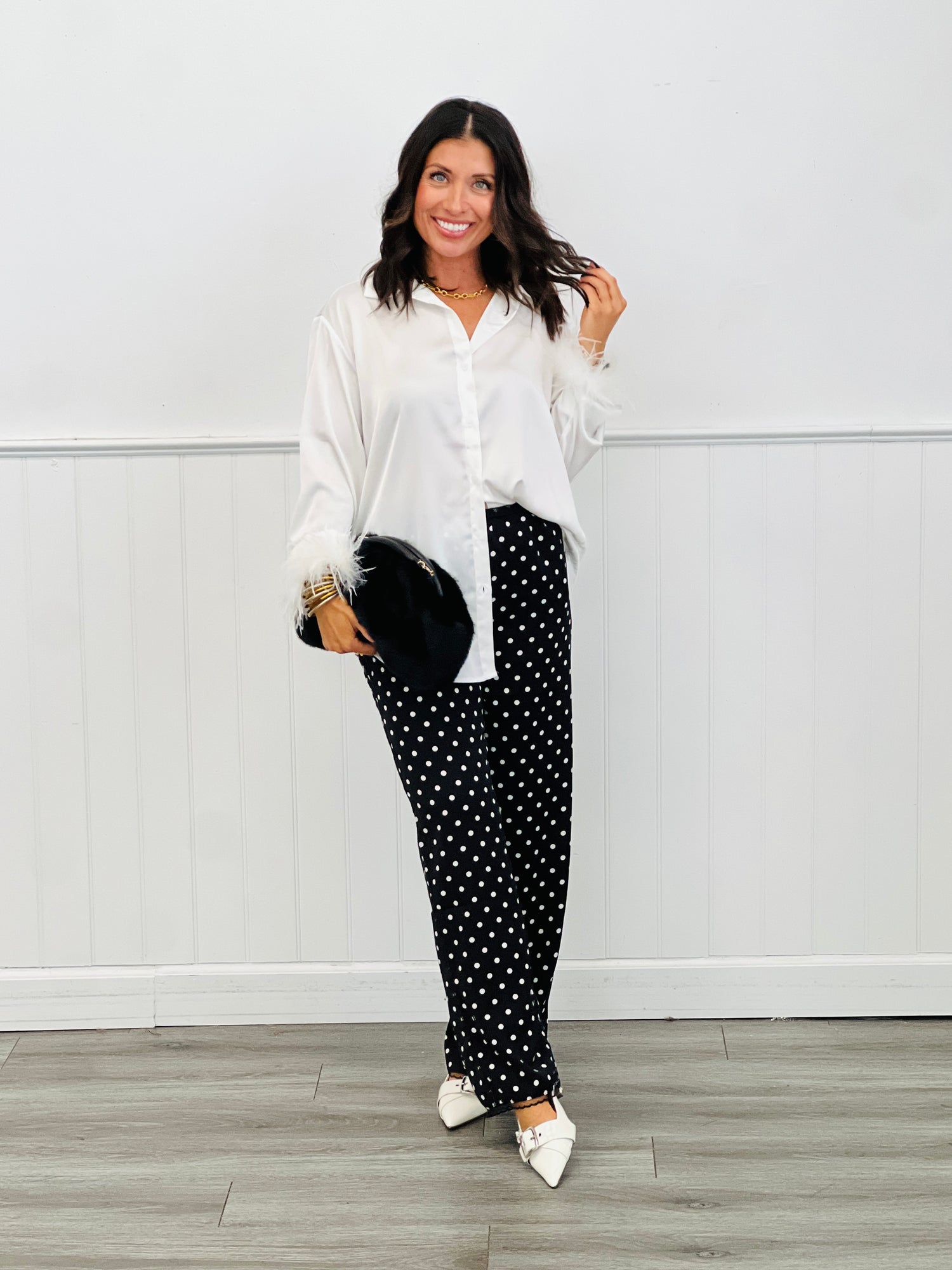 Add some flair to your wardrobe with this playful Satin Button Down Feather Sleeves Blouse. The bottom of the sleeves feature feather accents, adding a touch of whimsy to the classic collared design. Made of silky satin, this blouse is sure to make you stand out in a crowd! Available in 2 colors.