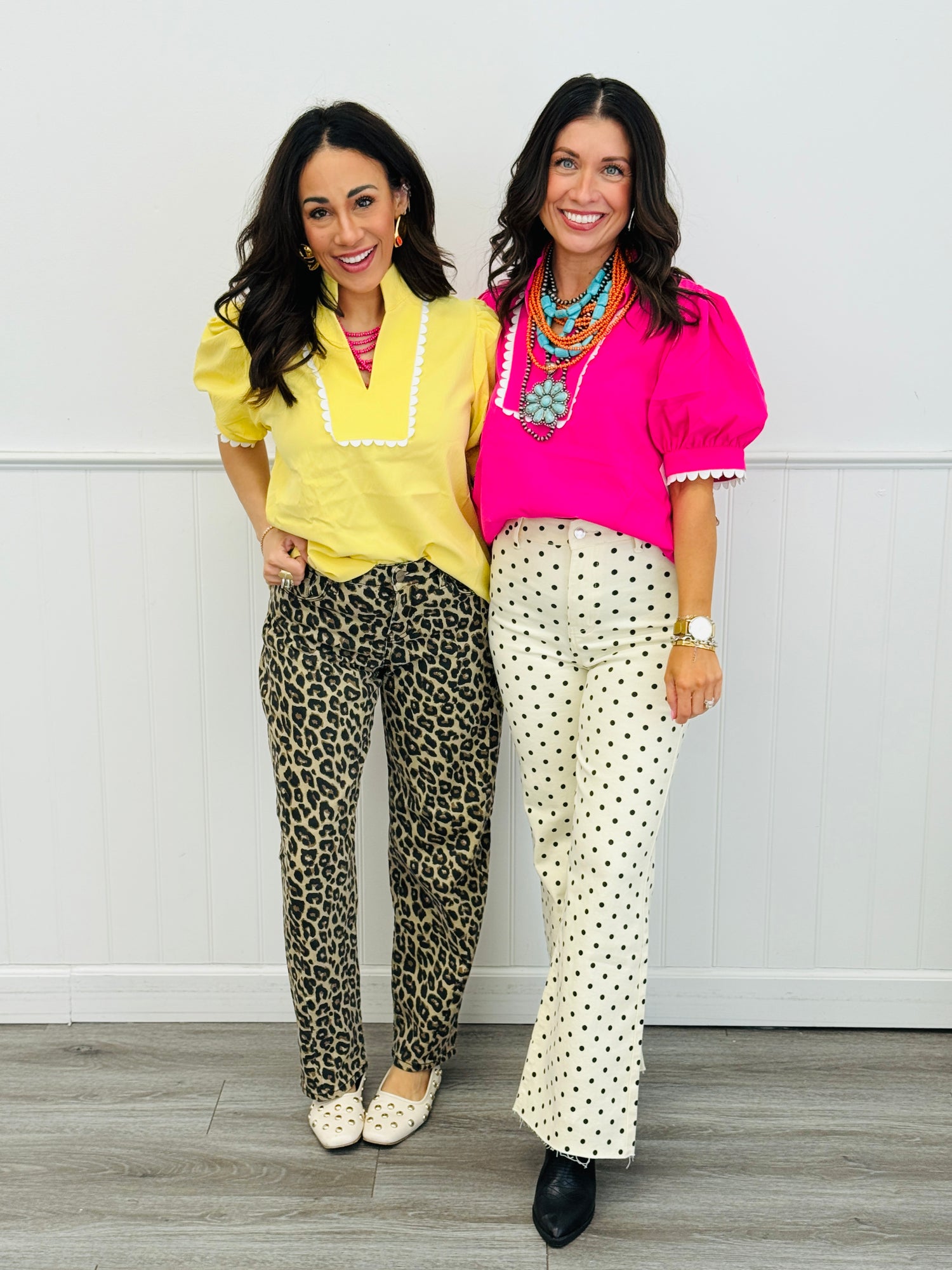 Elevate your everyday style with this charming crinkle top featuring delightful puff sleeves and a playful scallop trim accent. The standing neckline with notched V-neck creates a flattering silhouette that's perfect for mixing and matching. Crafted from textured crinkle fabric, this versatile piece brings effortless movement and visual interest to any outfit. Available in two gorgeous colors to match your mood.