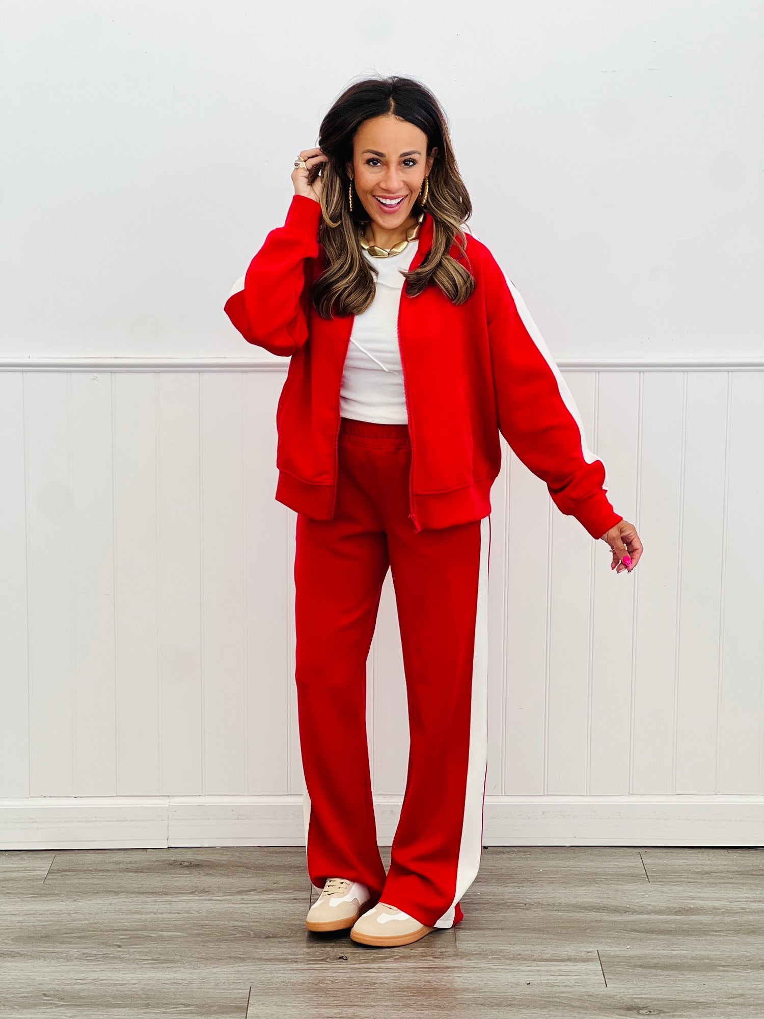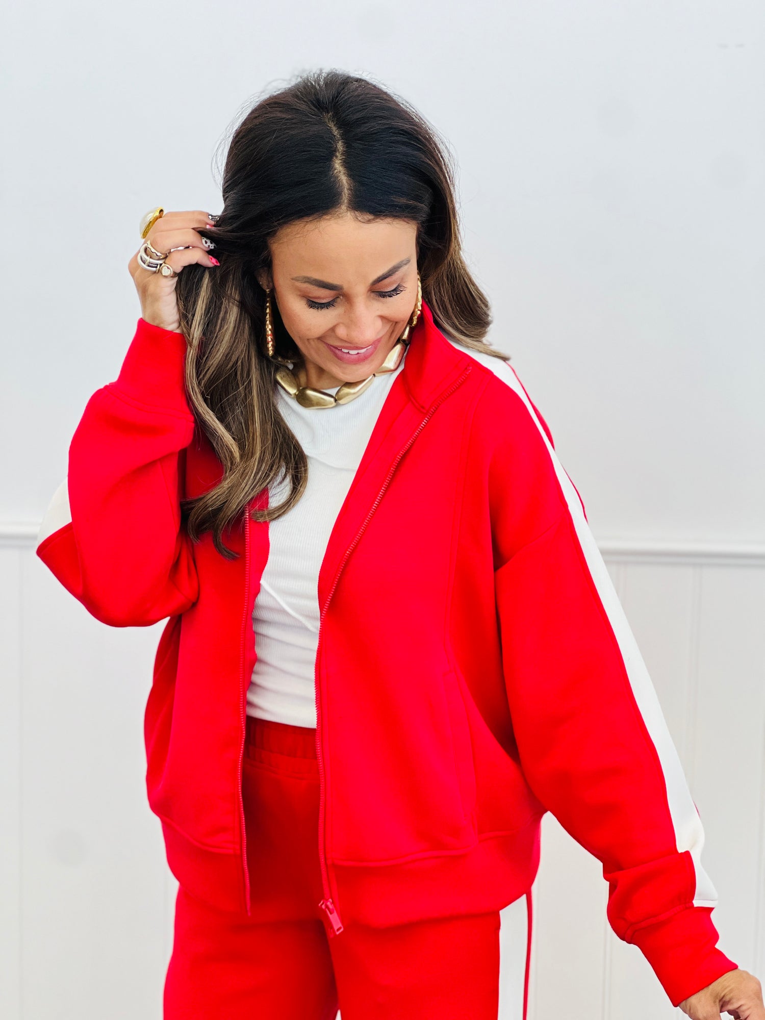 Elevate your active-chic style with this modal scuba zip-up jacket, crafted from silky smooth and lightweight fabric. Featuring sleek color contrast striping along the sleeves, it blends luxurious comfort with a sporty edge. Match to Pant BOT5012.