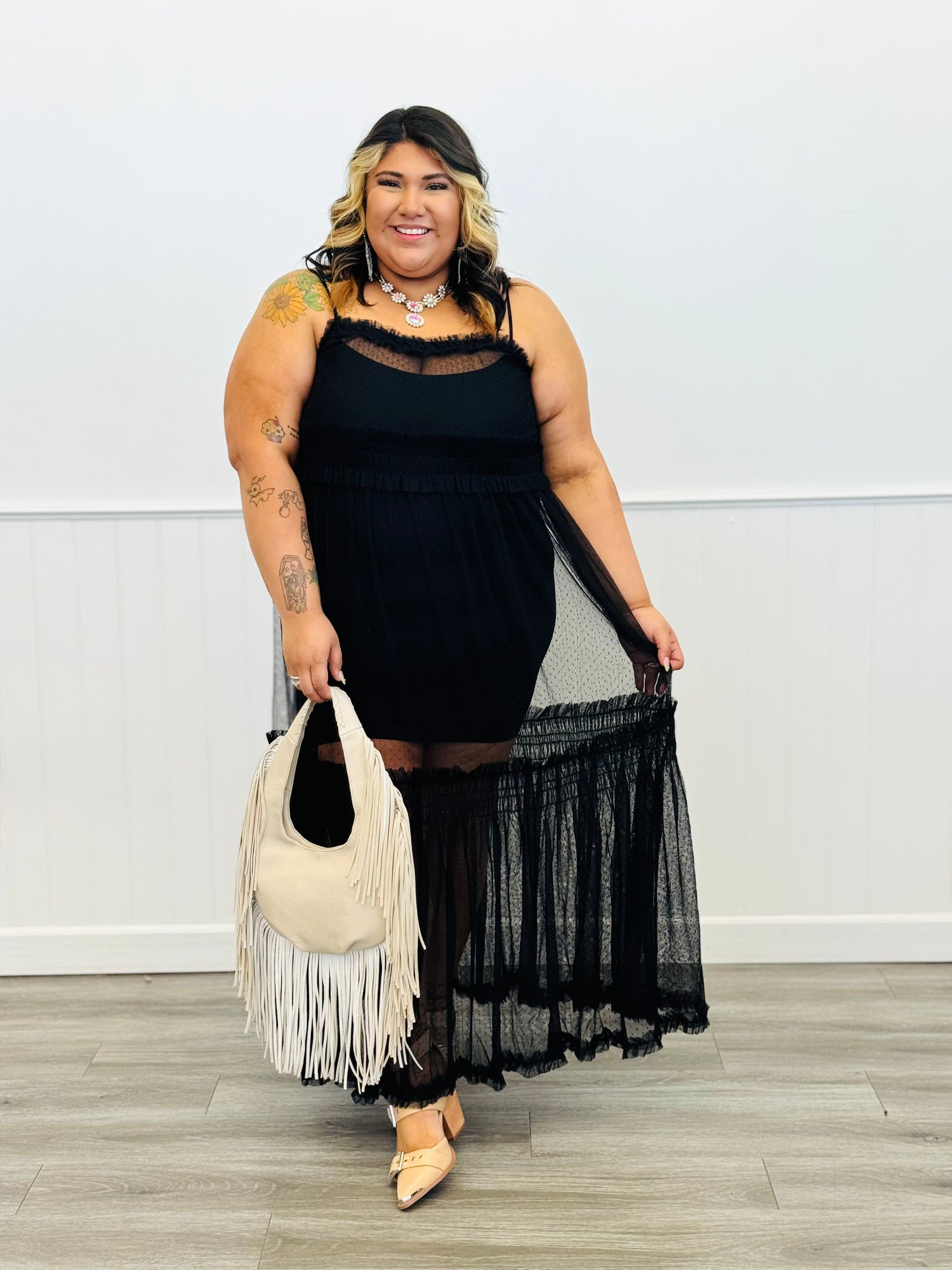 Get ready to turn heads at the beach or dinner wearing our strappy Sheer Delight Lace Maxi Dress! This whimsical dress features a delicate sheer lace fabrication, adjustable spaghetti straps, stretchy bodice and flowy skirt with wide ruffled hem. Perfect with body-con dress.
