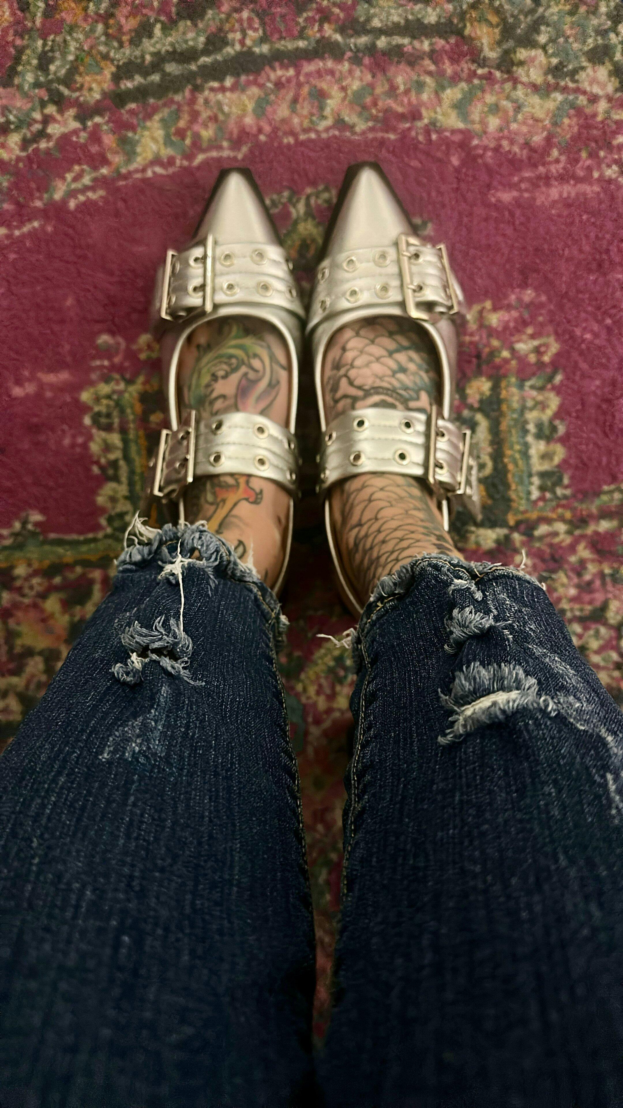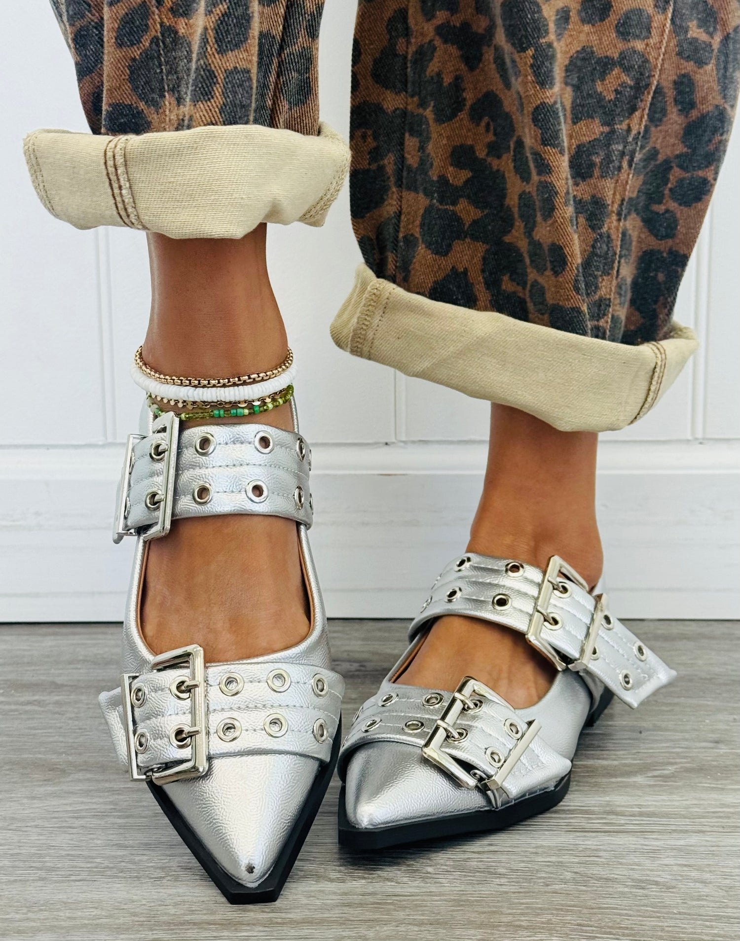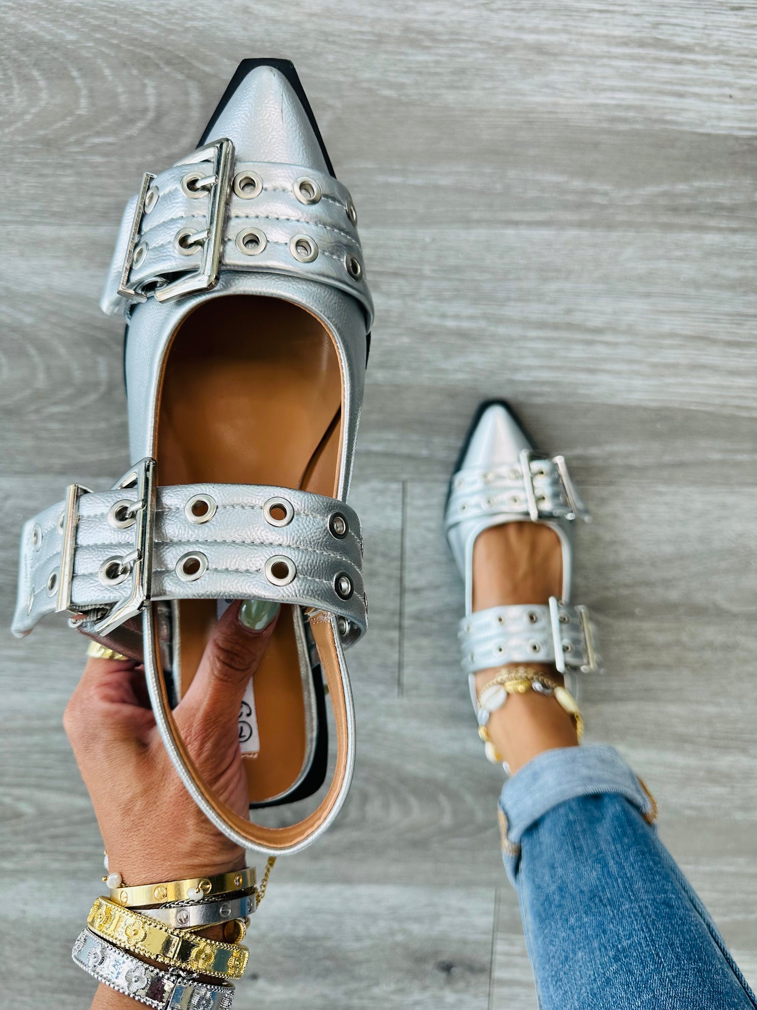Get ready to buckle up and step into style with our Silver Buckle It Up Slingback Flats! The pointed toe adds a touch of sophistication, while the sling back design and eyelet detailing add a unique twist to these flats. Comfort and fashion come together in this must-have pair!
