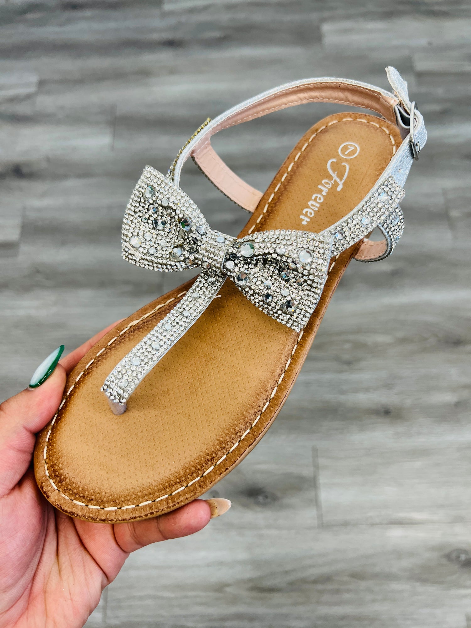 Dazzle in these slip on sandals with sparkling Silver rhinestones and a charming bow. Securely fasten them with a convenient buckle closure. Perfect for any occasion, show off your love for champagne with every step!