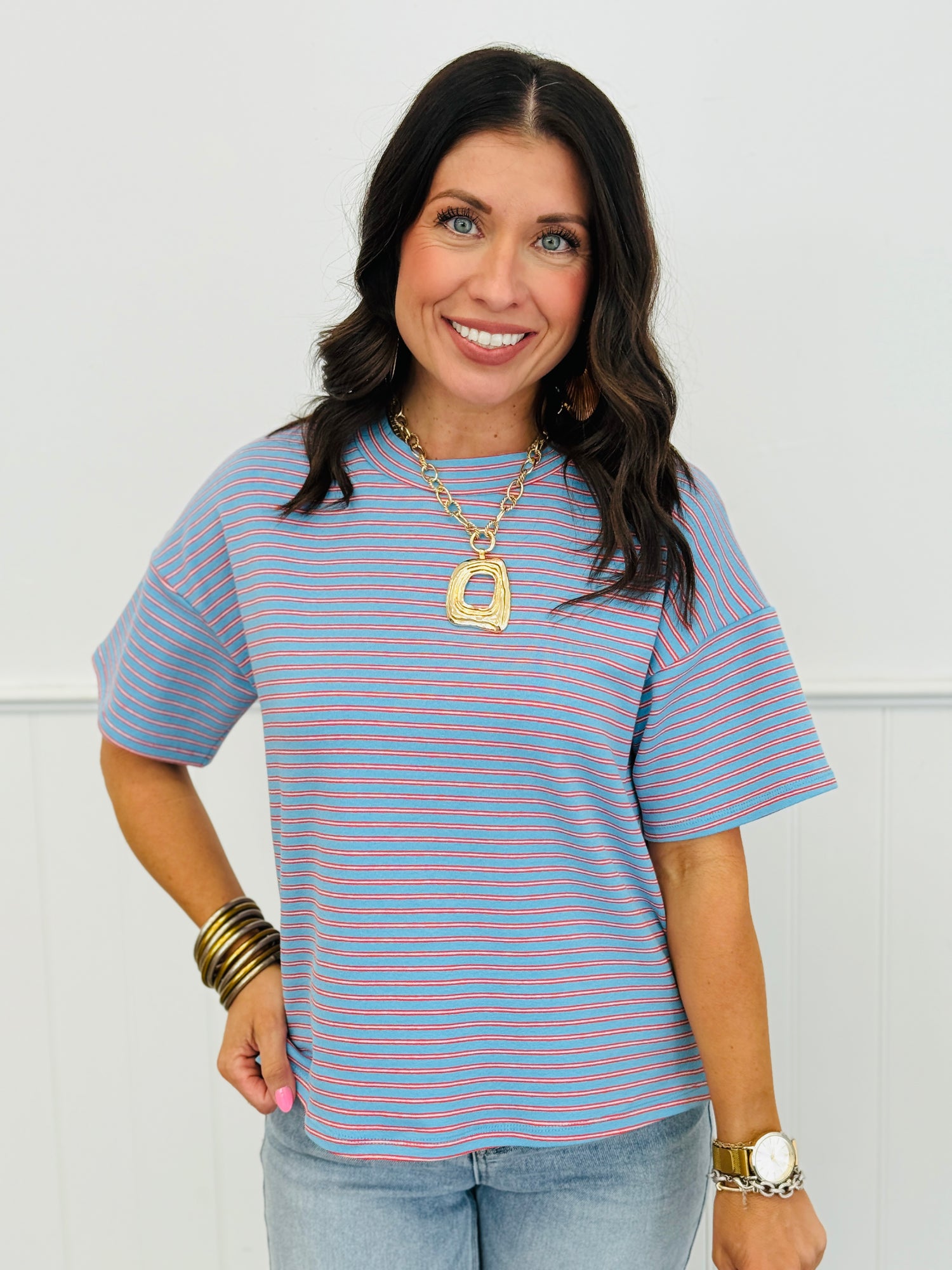 Effortlessly chic and ready for anything, this sky blue striped tee brings a fresh, breezy vibe to your everyday rotation. The classic horizontal stripes add visual interest while the short sleeves keep things cool and comfortable. Practical side slits offer easy movement and a modern silhouette that flatters every frame. Perfect for pairing with your favorite jeans, shorts, or layering under a jacket—this versatile staple deserves a permanent spot in your closet.