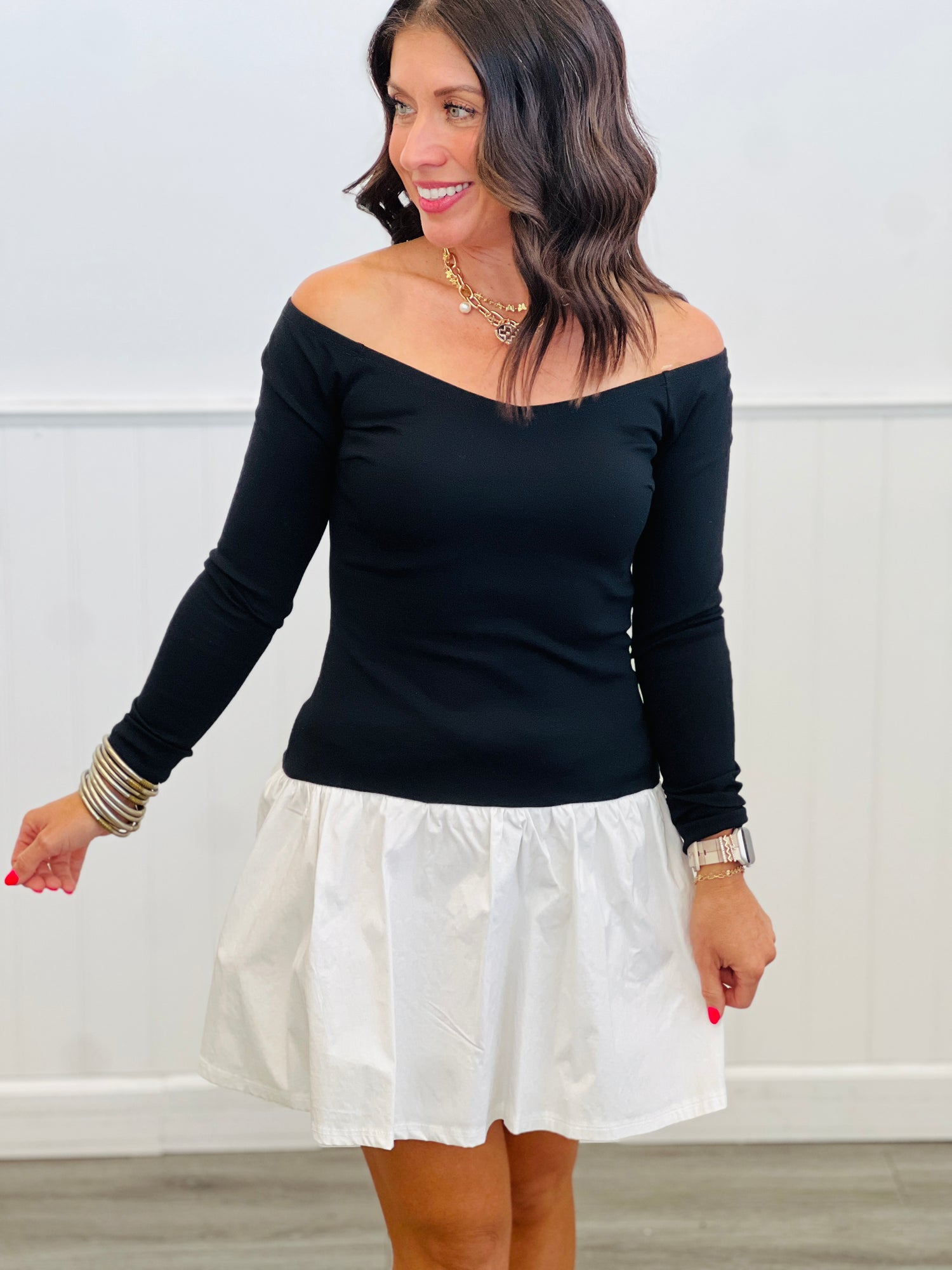 Super cute long sleeved mini dress features a black off shoulder fitted stretchy bodice with dropped waist and straight neckline attached to a gathered white flowy mini skirt.