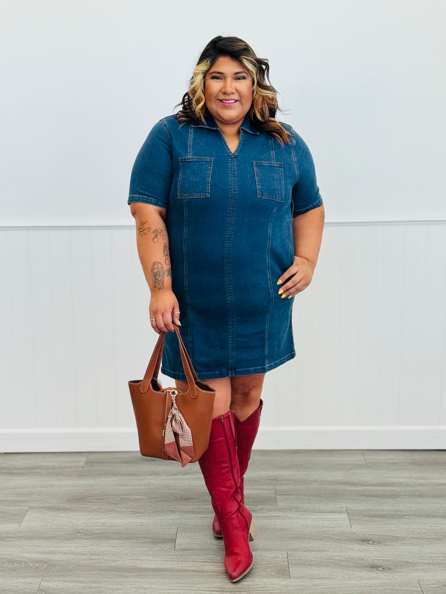Stretch Denim Pocket Mini Dress (Reg & Plus)