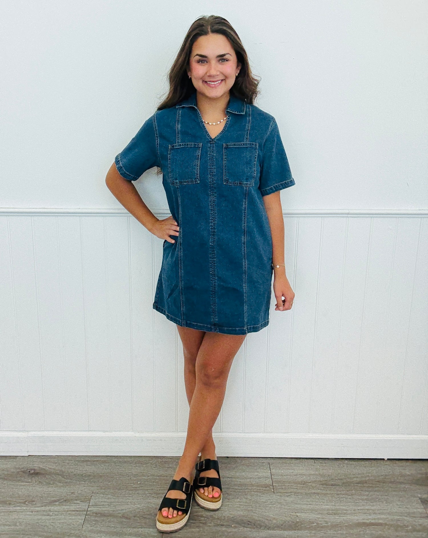 Super cute and effortless pullover Stretch Denim Pocket Mini Dress features a v-neck, 3/4 sleeves, side pockets and a a flattering relaxed slightly flared silhouette. Dark denim fabric.