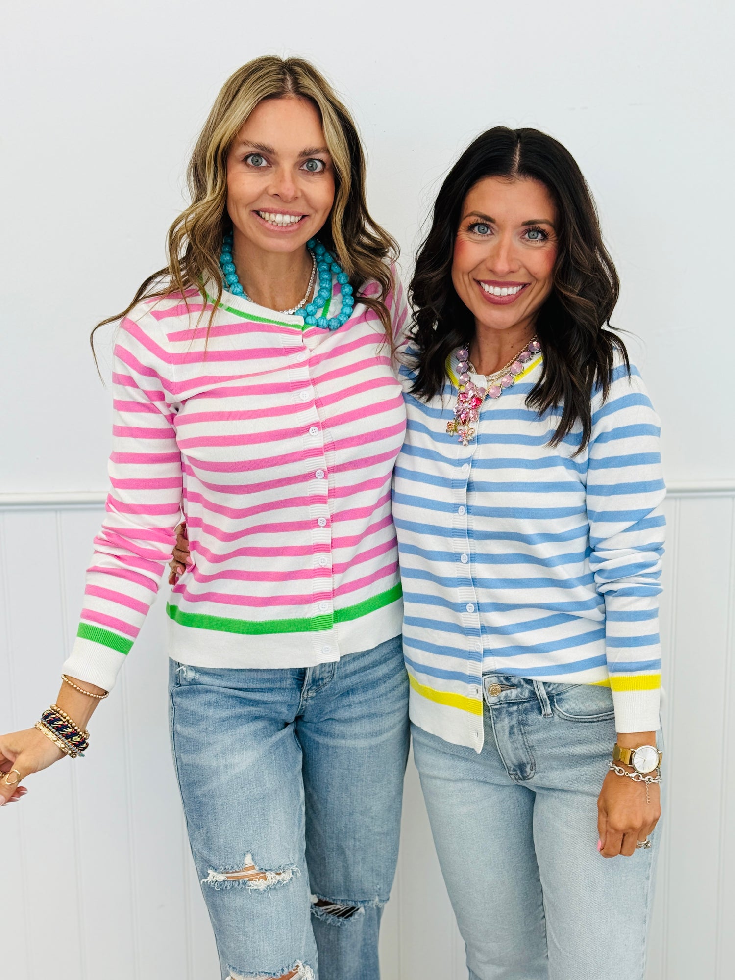 Layer up with effortless charm in this striped button-up cardigan! Featuring playful contrast trim along the neckline, hem, and sleeve cuffs, it's the perfect piece to elevate any outfit. The classic chambray striped pattern pairs beautifully with the unexpected pop of color at the edges, making it ideal for casual days or dressed-up occasions. Available in two versatile colorways, this cardigan is a wardrobe essential that works as hard as you do.
