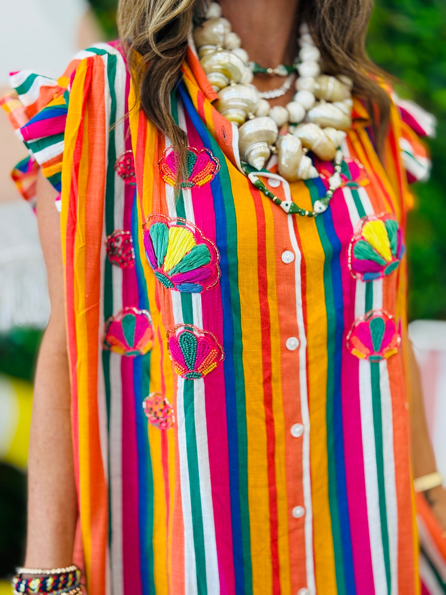 Elevate your wardrobe with this enchanting Striped Seashell Ruffle Sleeves Mini Dress. Featuring delicate sequin and bead embellishments that catch the light beautifully, this one-size piece combines playful striped detailing with romantic ruffle sleeves for an effortlessly chic look. Perfect for parties, nights out, or any occasion where you want to shine. The mini silhouette offers a flirty, modern edge while the shimmering beadwork adds glamorous dimension. A versatile statement piece that transitions seamlessly from day to evening.