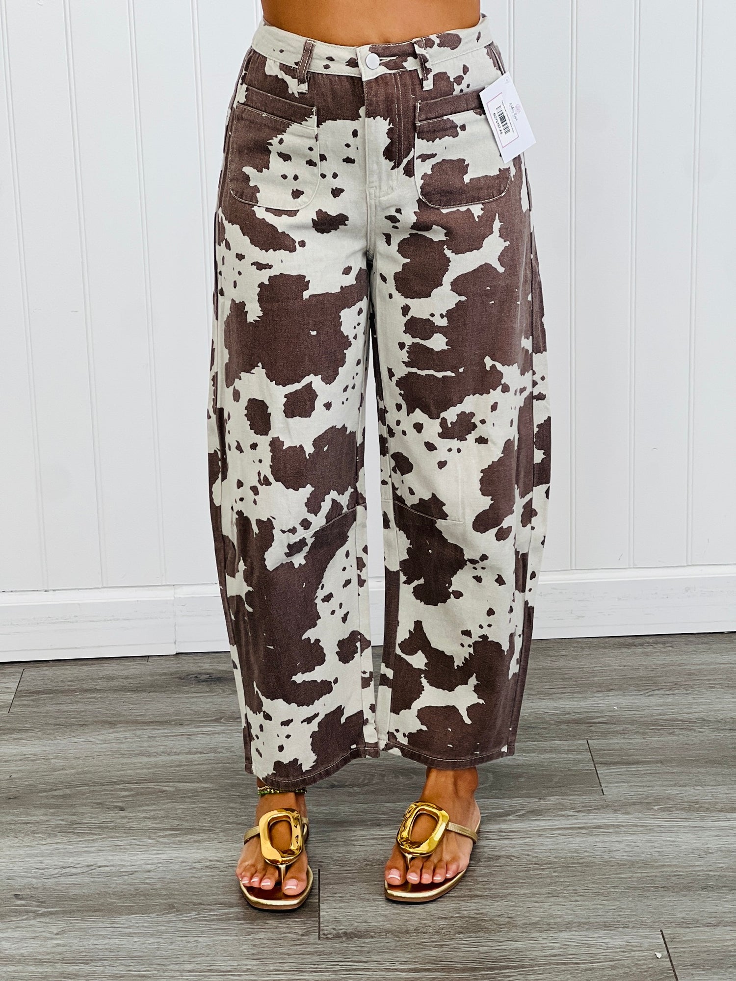 Introducing the super cute on-trend Taupe Brown Cow Print Jeans. Features include a front button & zipper closure, belt loops, front and back patch pockets and relaxed straight legs.