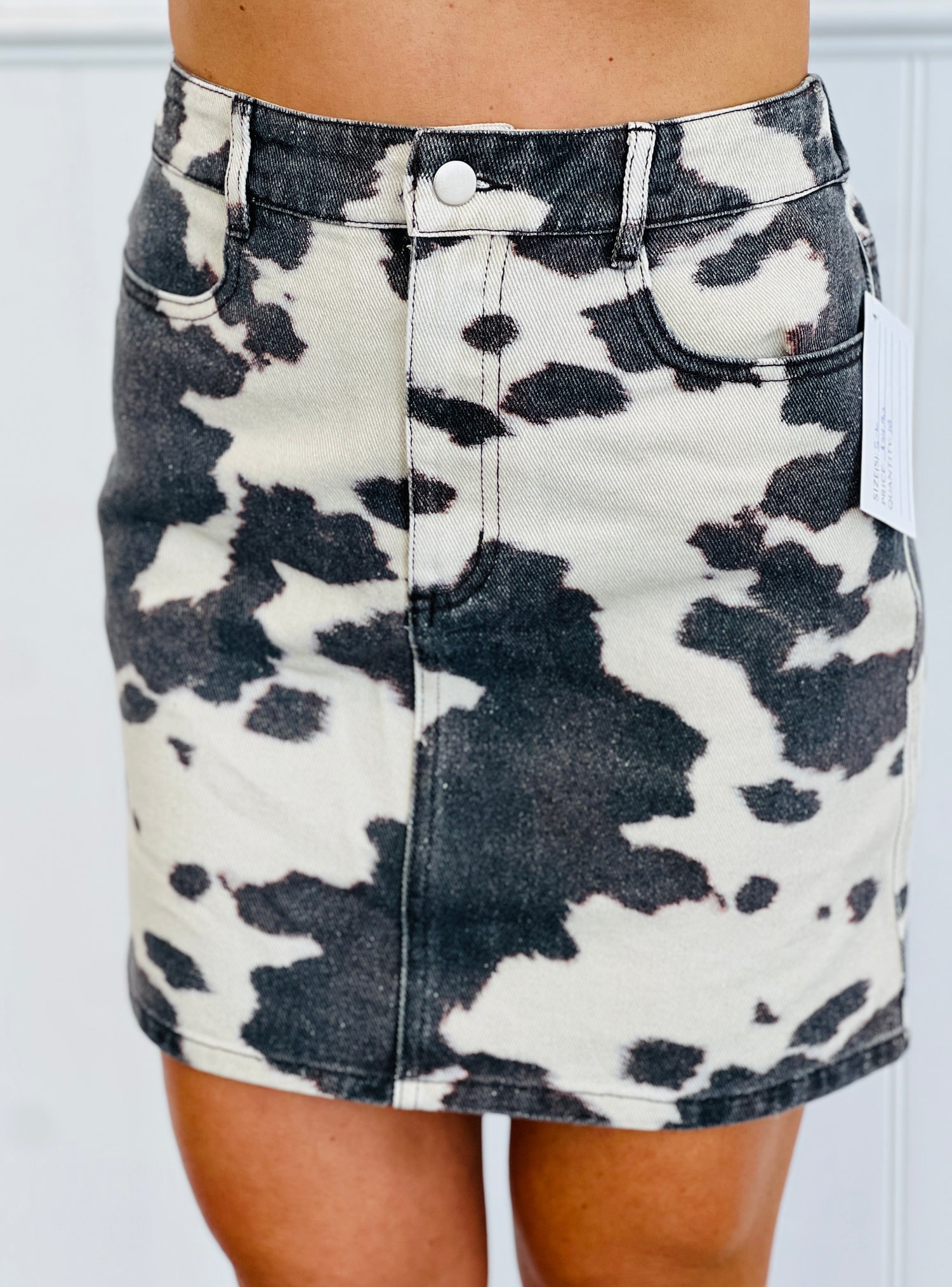 Add something unique to your wardrobe with our Taupe/Brown Cow Print Mini Skirt. This super cute cow print cutie is designed with a front button & zipper closure, pockets and back elastic waist. Perfect match to with jacket CAR3348.