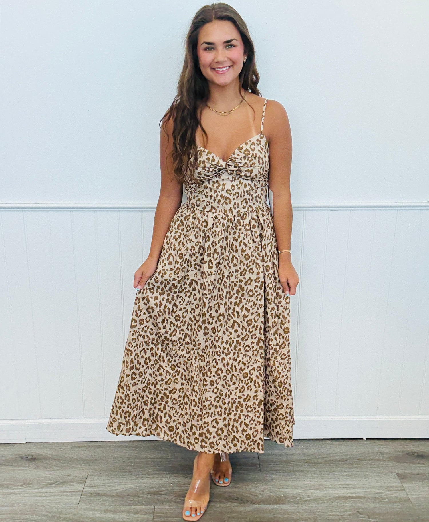 Introducing the fun and fabulous Taupe Cheetah Print Twisted Cami Midi Dress! Features include a wide v-neckline, twisted cami bodice, adjustable spaghetti straps, smocked back, back zipper closure, flowy skirt and side pockets.