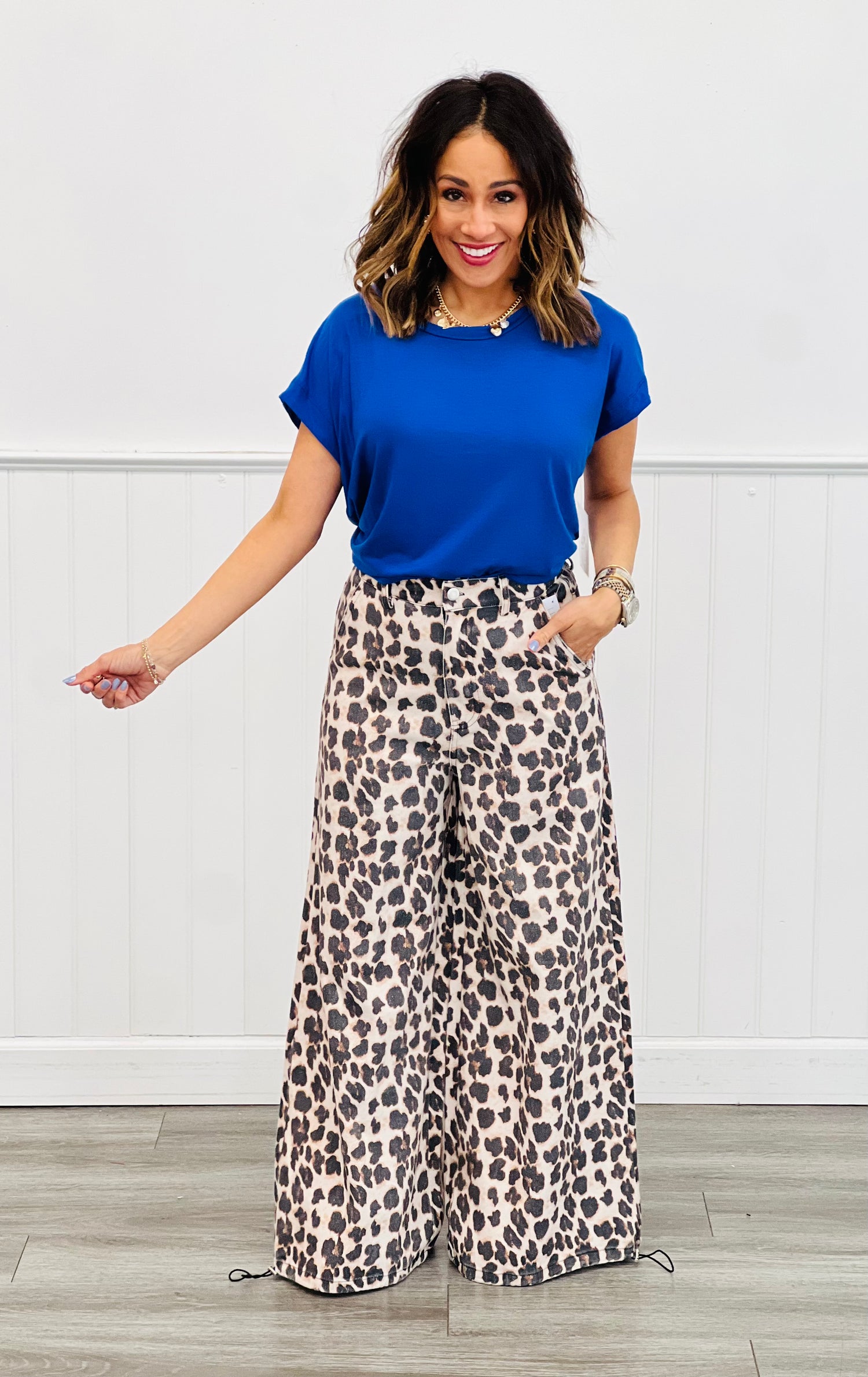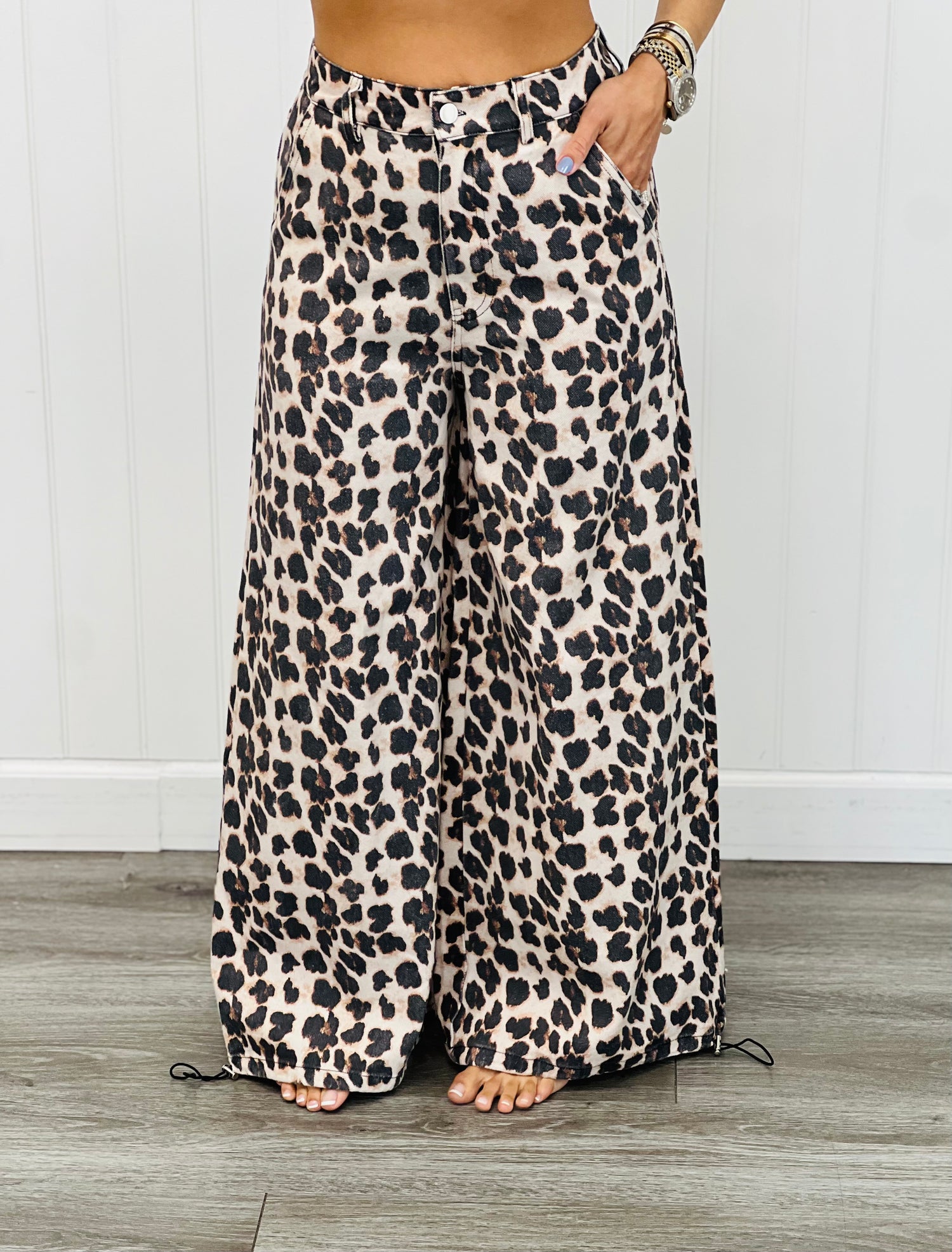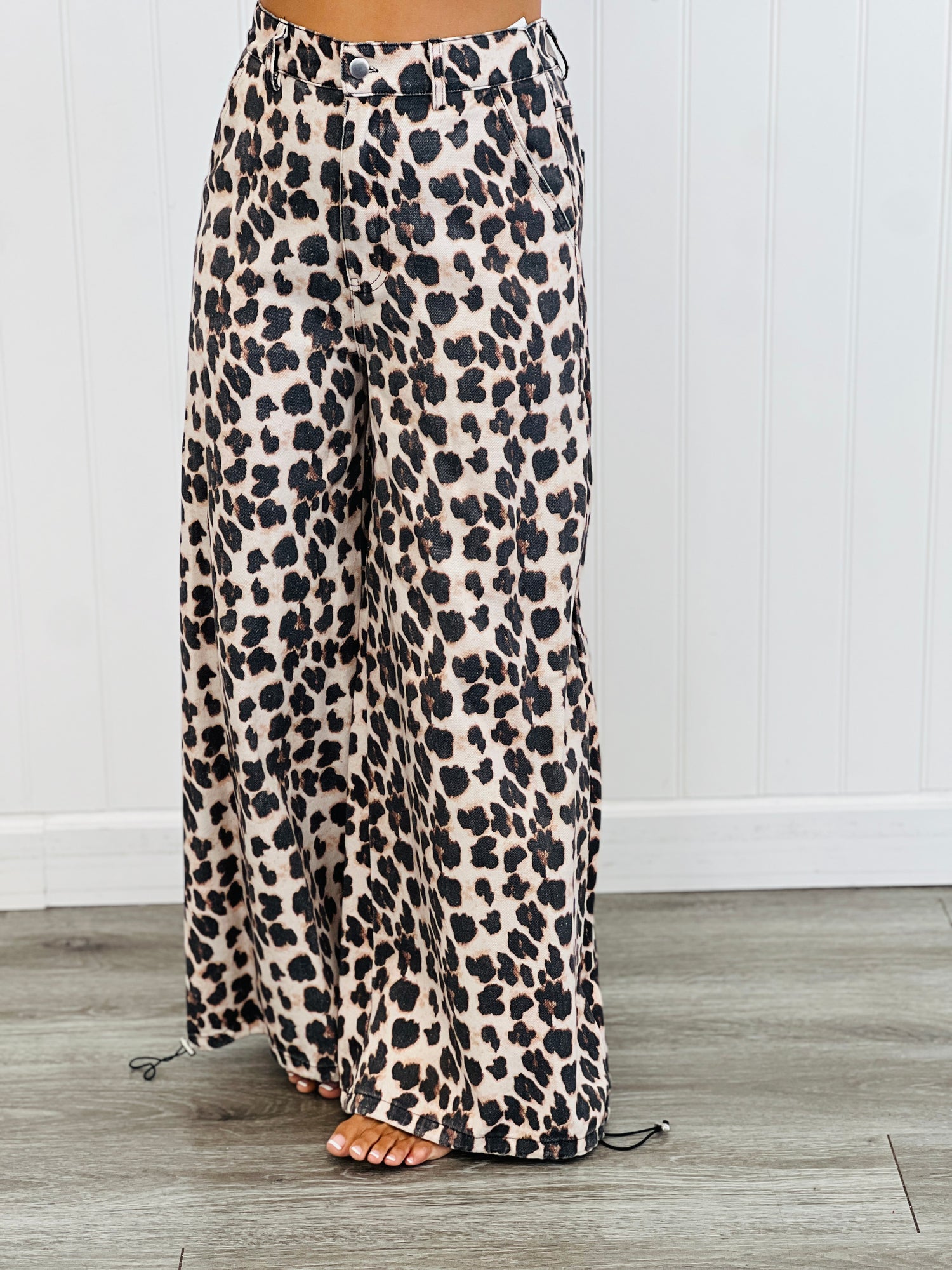 Unleash your inner fierceness with our Taupe Leopard Drawstring Cuff Pants These pants feature a unique wide genie leg with adjustable drawstring at cuffs plus a button and zipper fly closure.